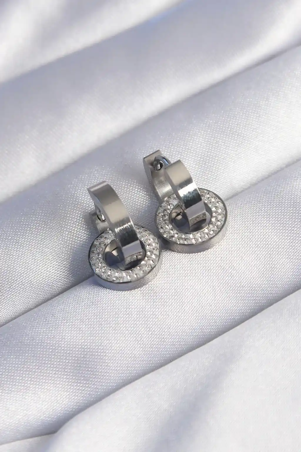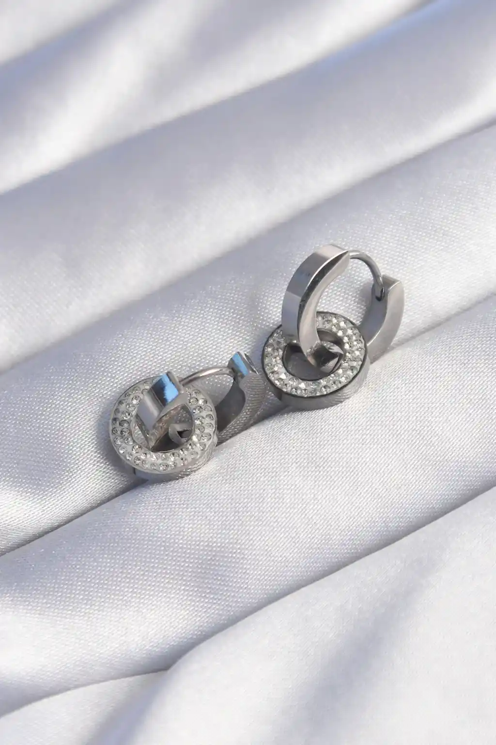 316L Çelik Gümüş Renk Zirkon Taşlı İç İçe Geçmeli Oval Küpe