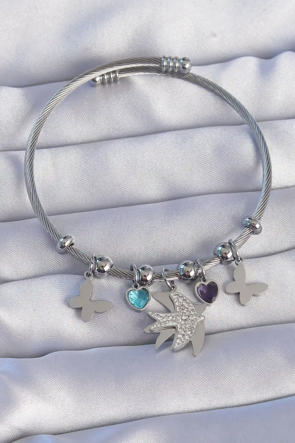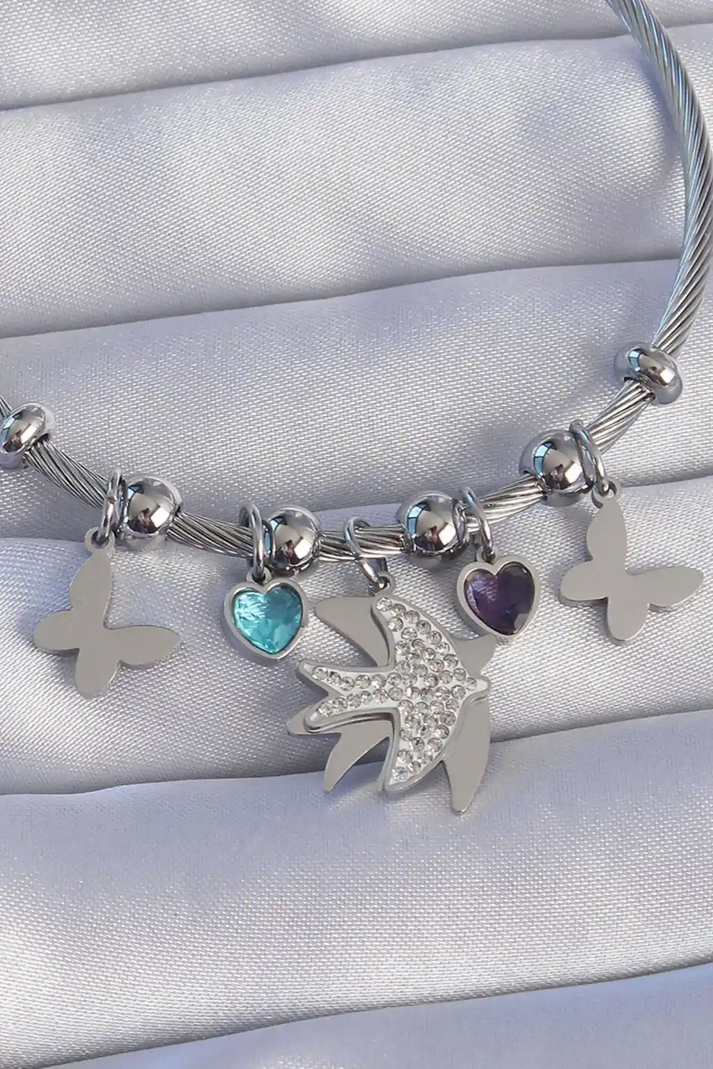 316L Çelik Gümüş Renk Zirkon Taşlı Kuş Tasarımlı Kelebek Detay Charm Bileklik