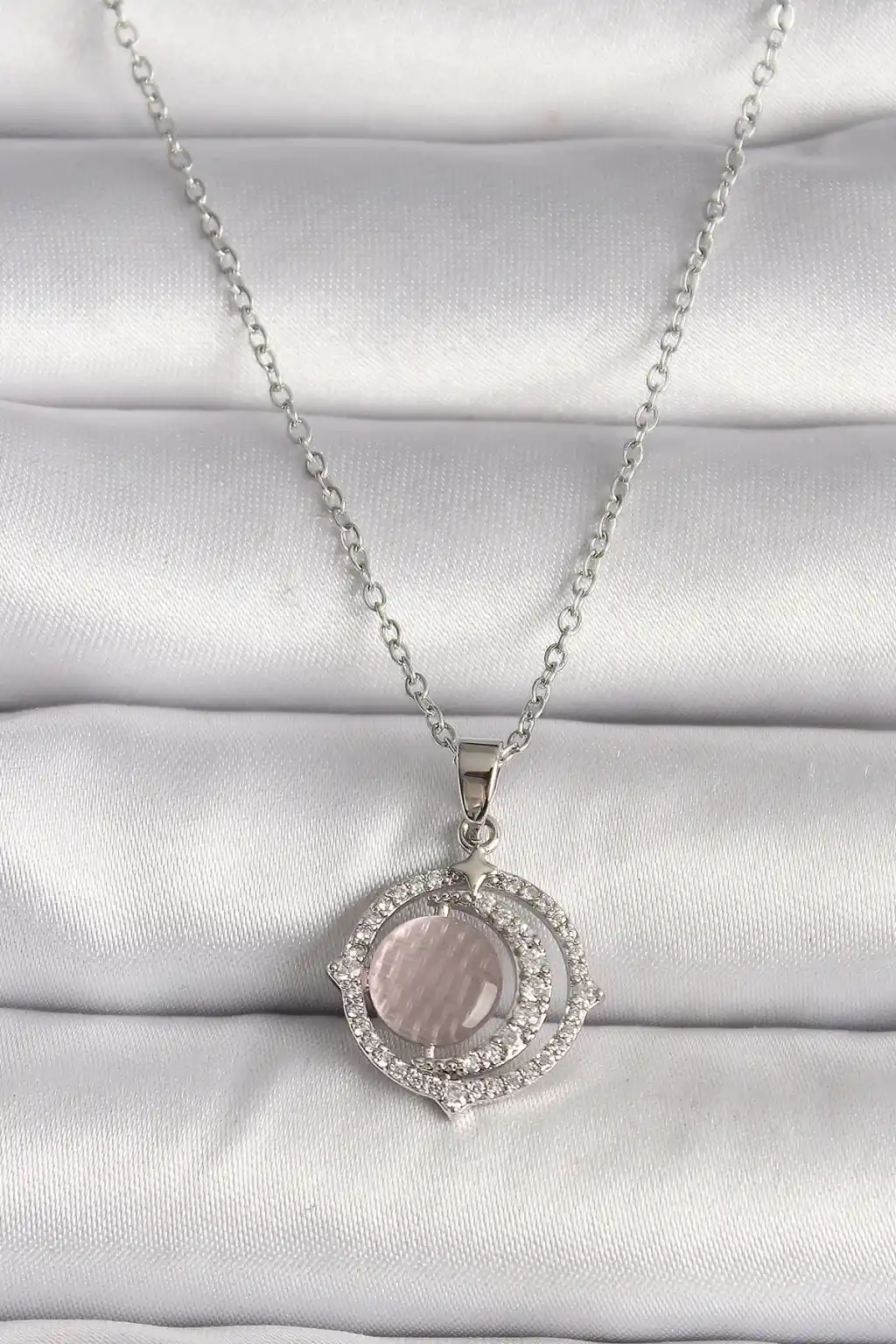 316L Çelik Gümüş Renk Zirkon Taşlı Pembe Sedefli Hilal Model Kadın Kolye