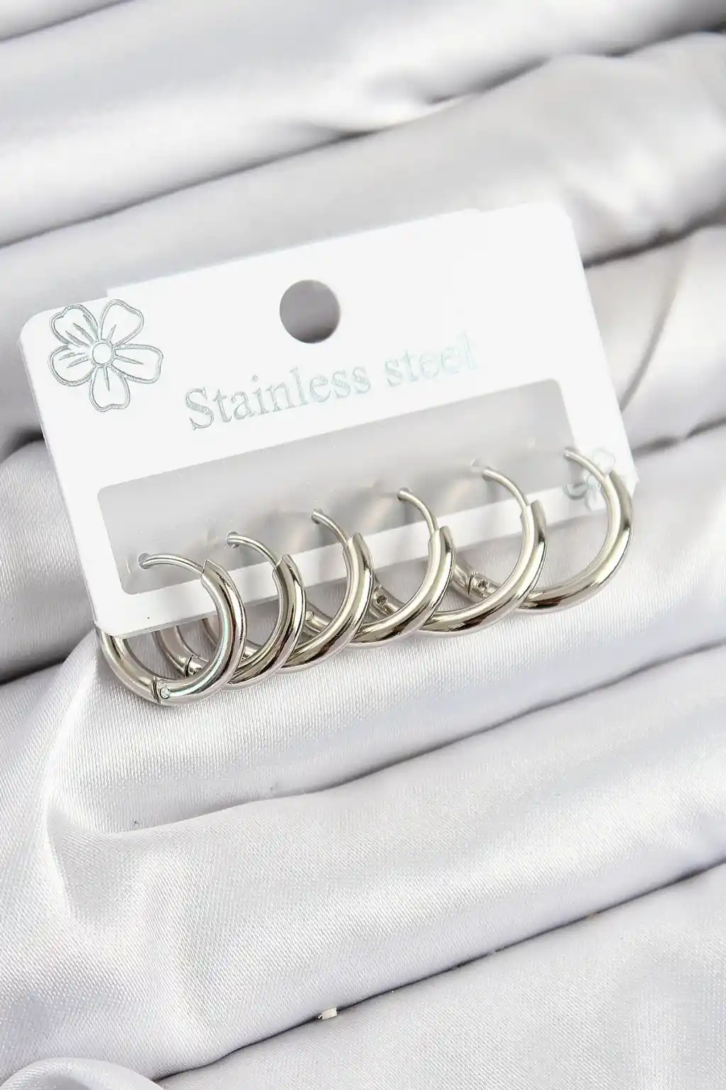 316L Çelik Halka Model Gümüş Renk 3'lü Set Kadın Küpe