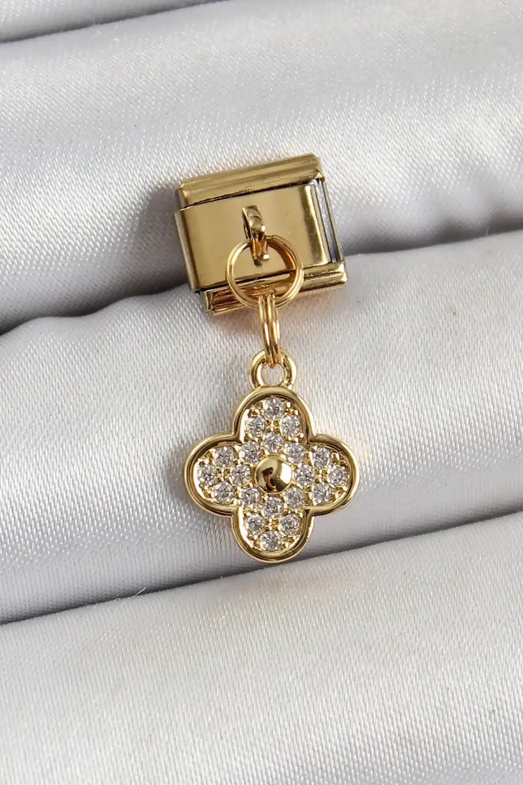 316L Çelik Sallantılı Zirkon Taşlı Yonca Model Gold Renk Nomination Charm