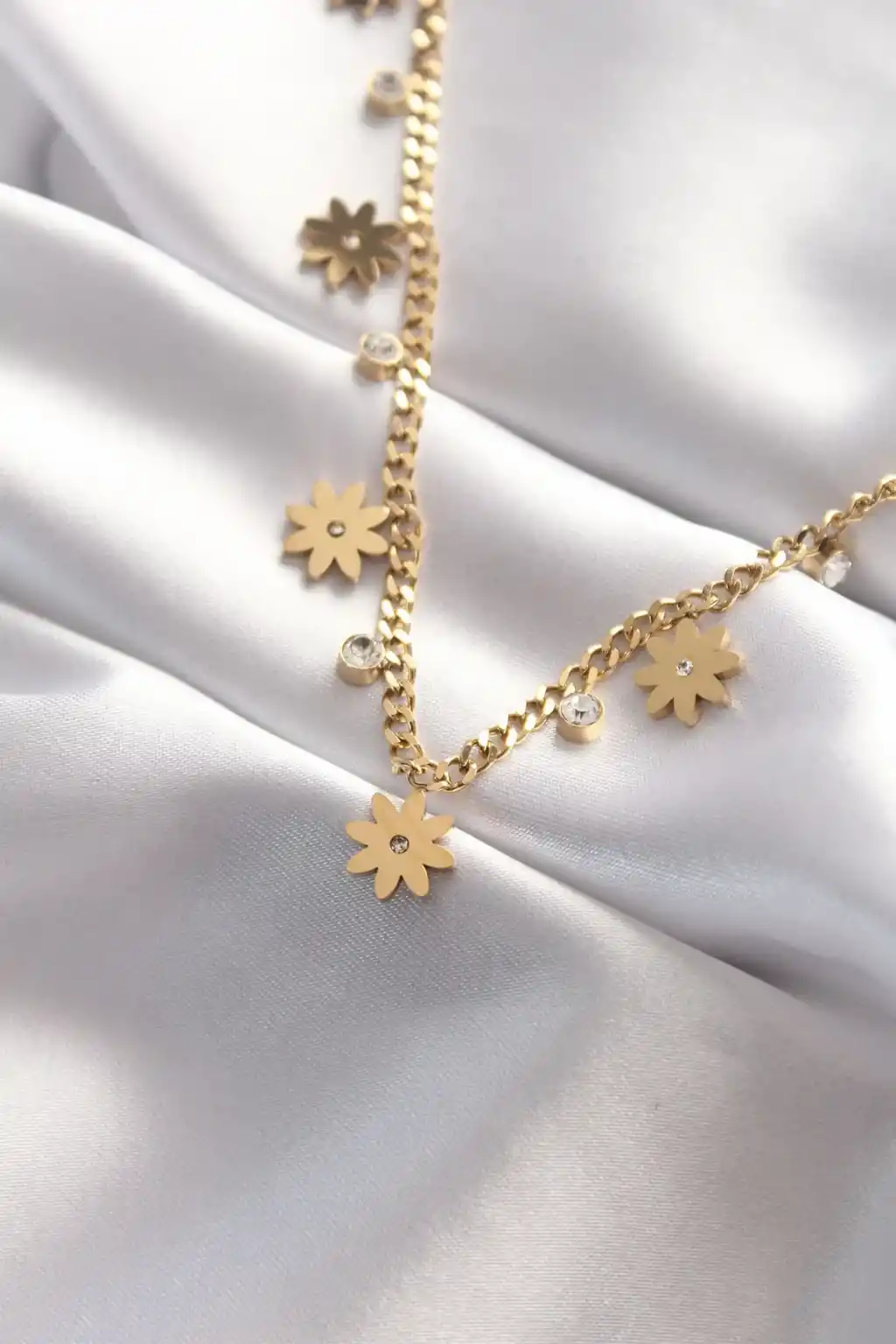 316L Çelik Taşlı Gold Renk Çoklu Çiçek Kolye