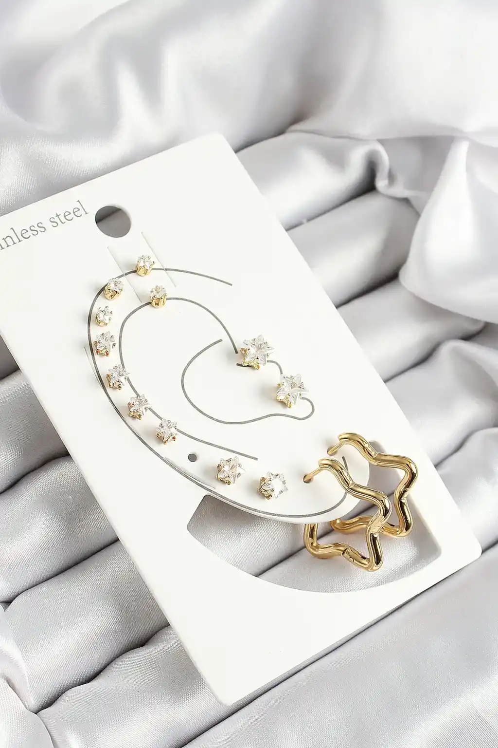 316L Çelik Yıldız Figürlü Ve Zirkon Taşlı Gold Renk 7'li Çift Kadın Küpe Set