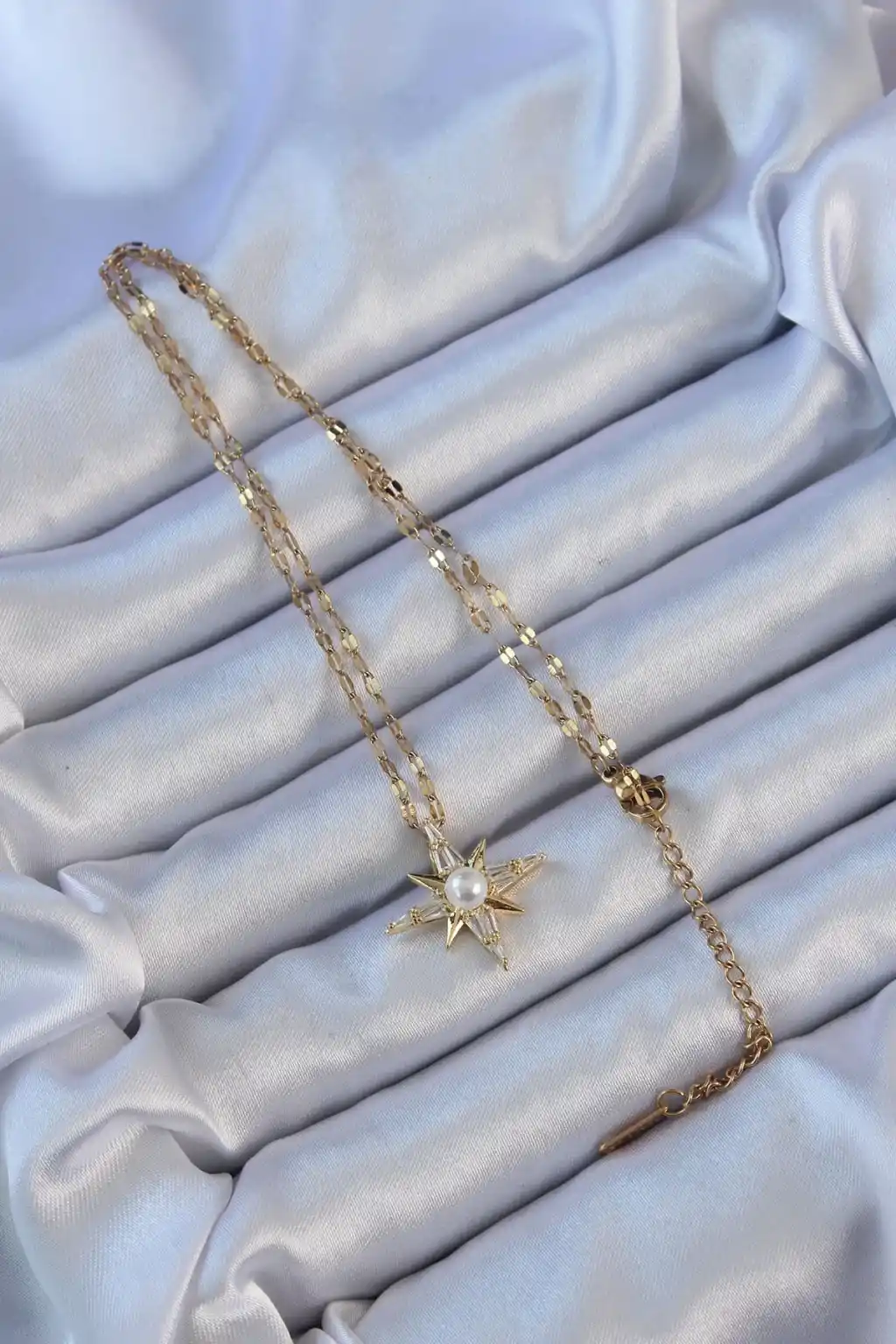 316L Çelik Zincir Altın Renk Baget Taşlı İnci Detay Kutup Yıldızı Kolye