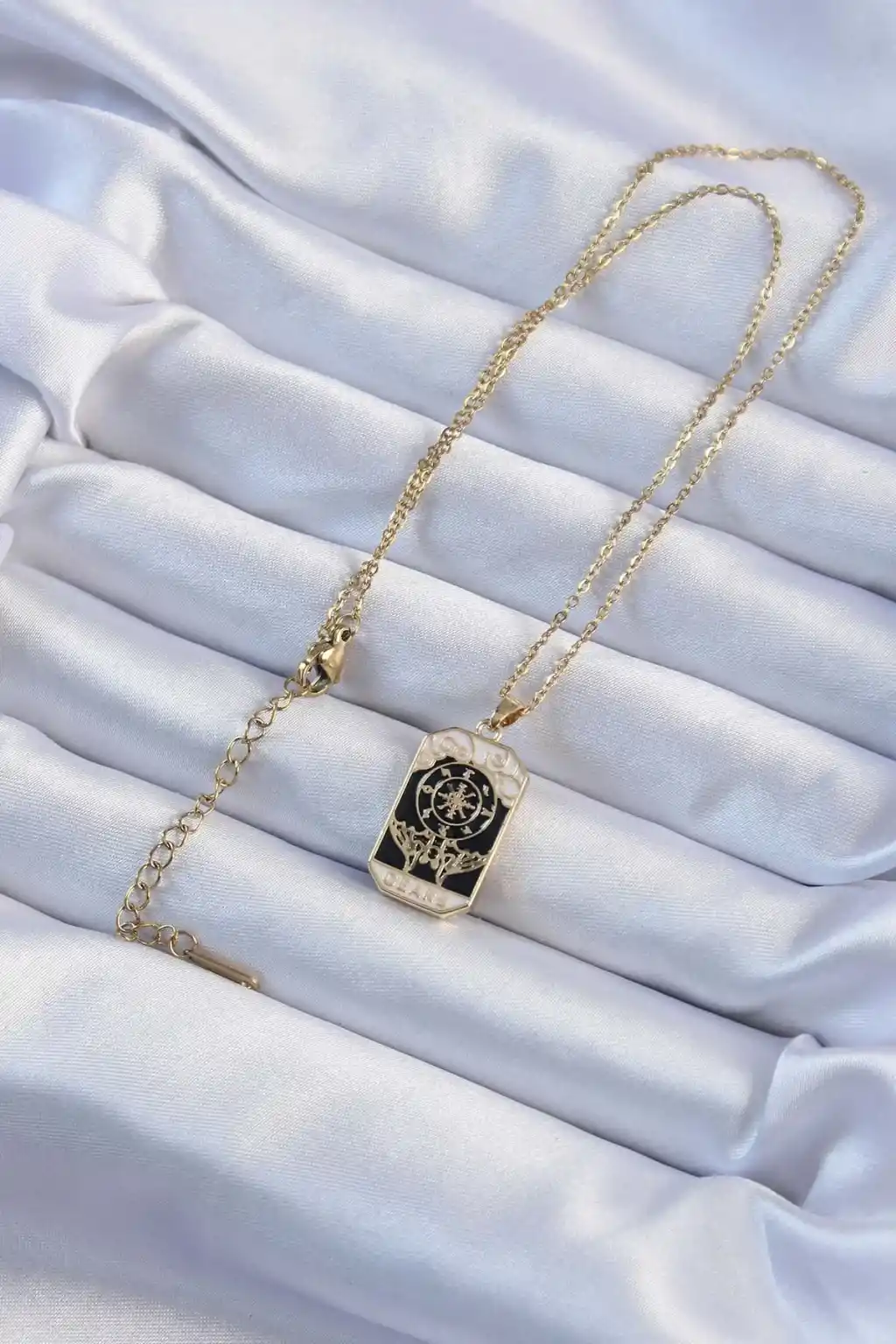 316L Çelik Zincir Altın Renk İşlemeli Siyah Mineli Tarot Kolye