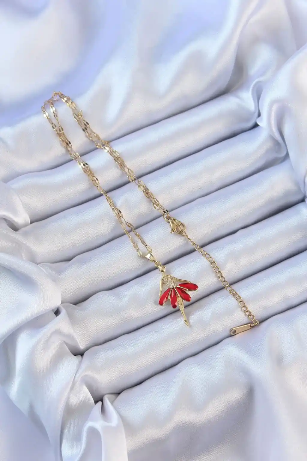 316L Çelik Zincir Altın Renk Kırmızı Etekli Zirkon Taşlı Balerin Kolye