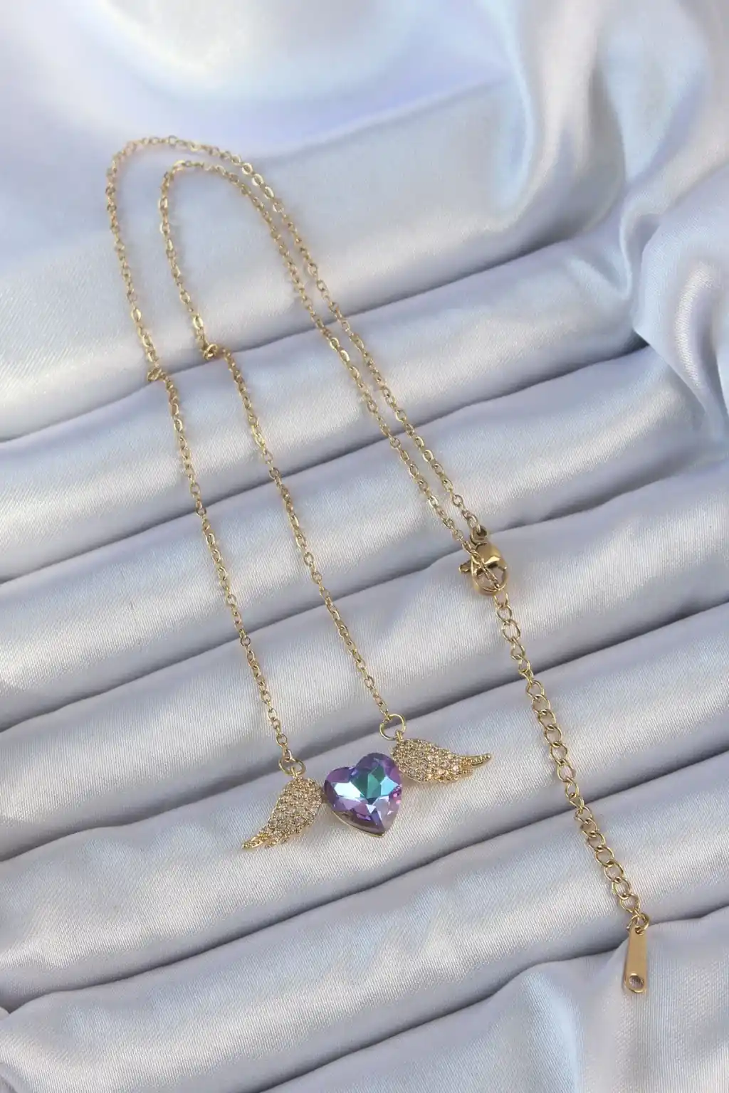 316L Çelik Zincir Altın Renk Mavi Mor Zirkon Taşlı Kanatlı Kalp Kolye