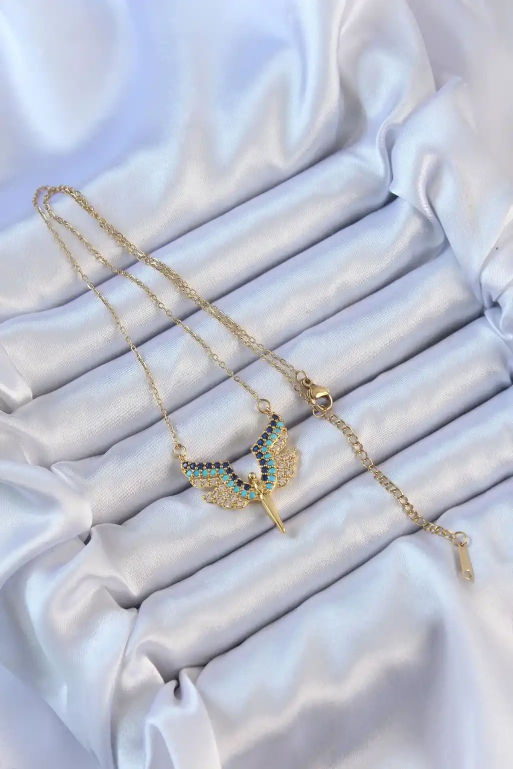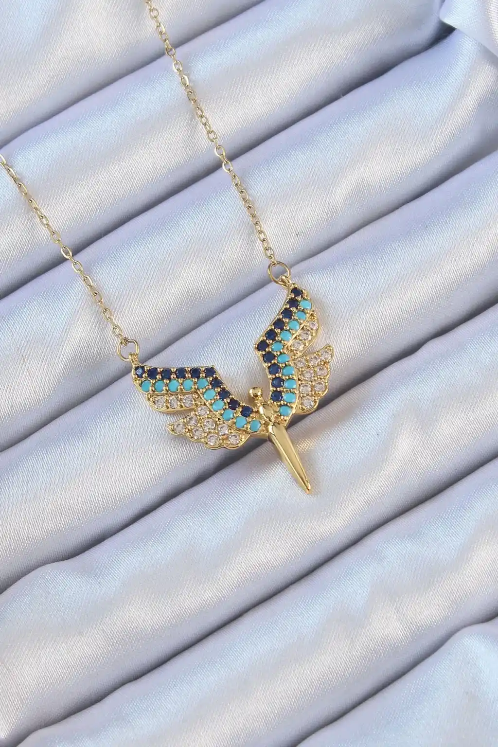 316L Çelik Zincir Altın Renk Mavi Zirkon Taşlı Mikail Meleği Kolye