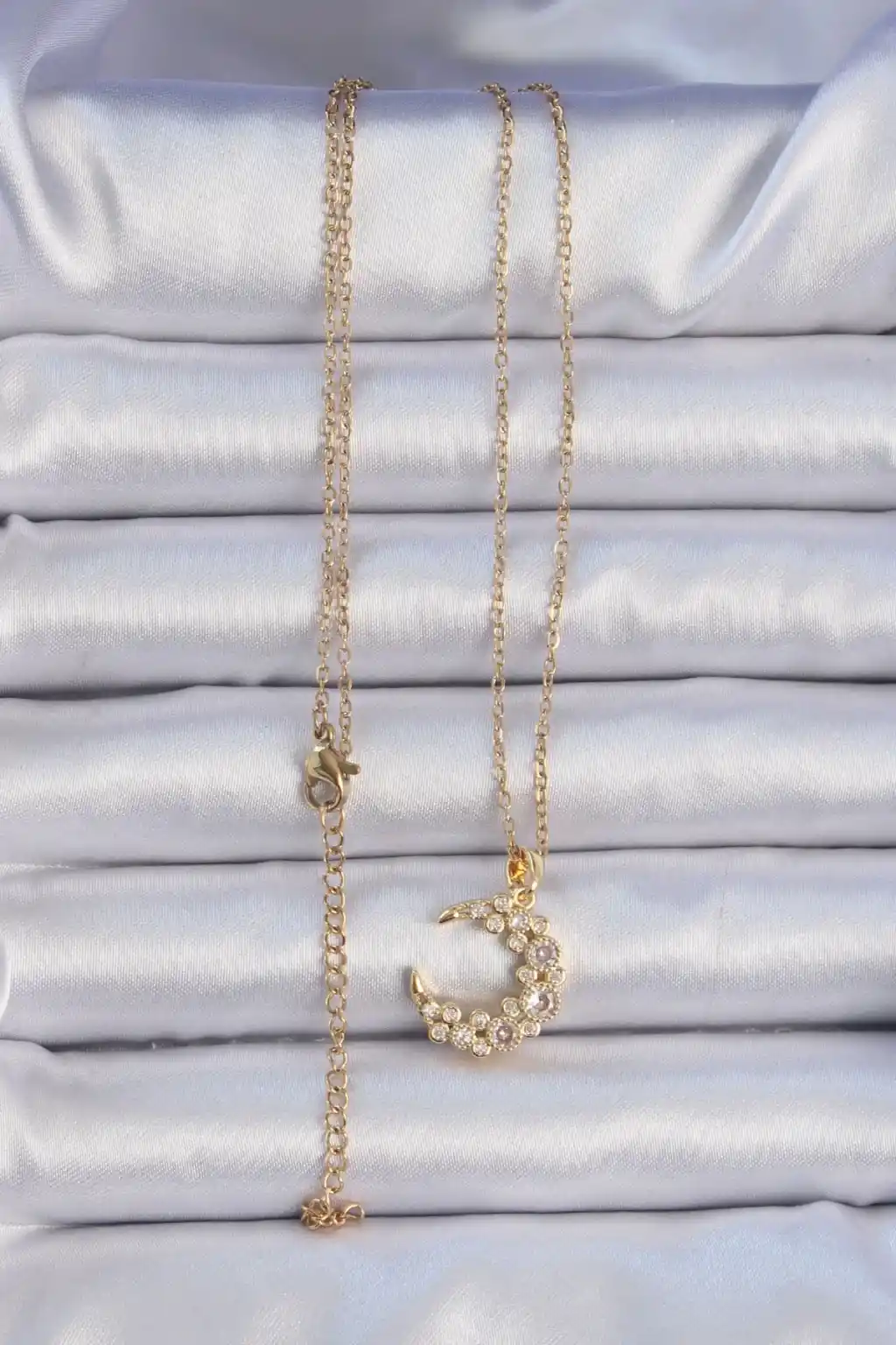 316L Çelik Zincir Altın Renk Zirkon Taşlı Ay Kolye