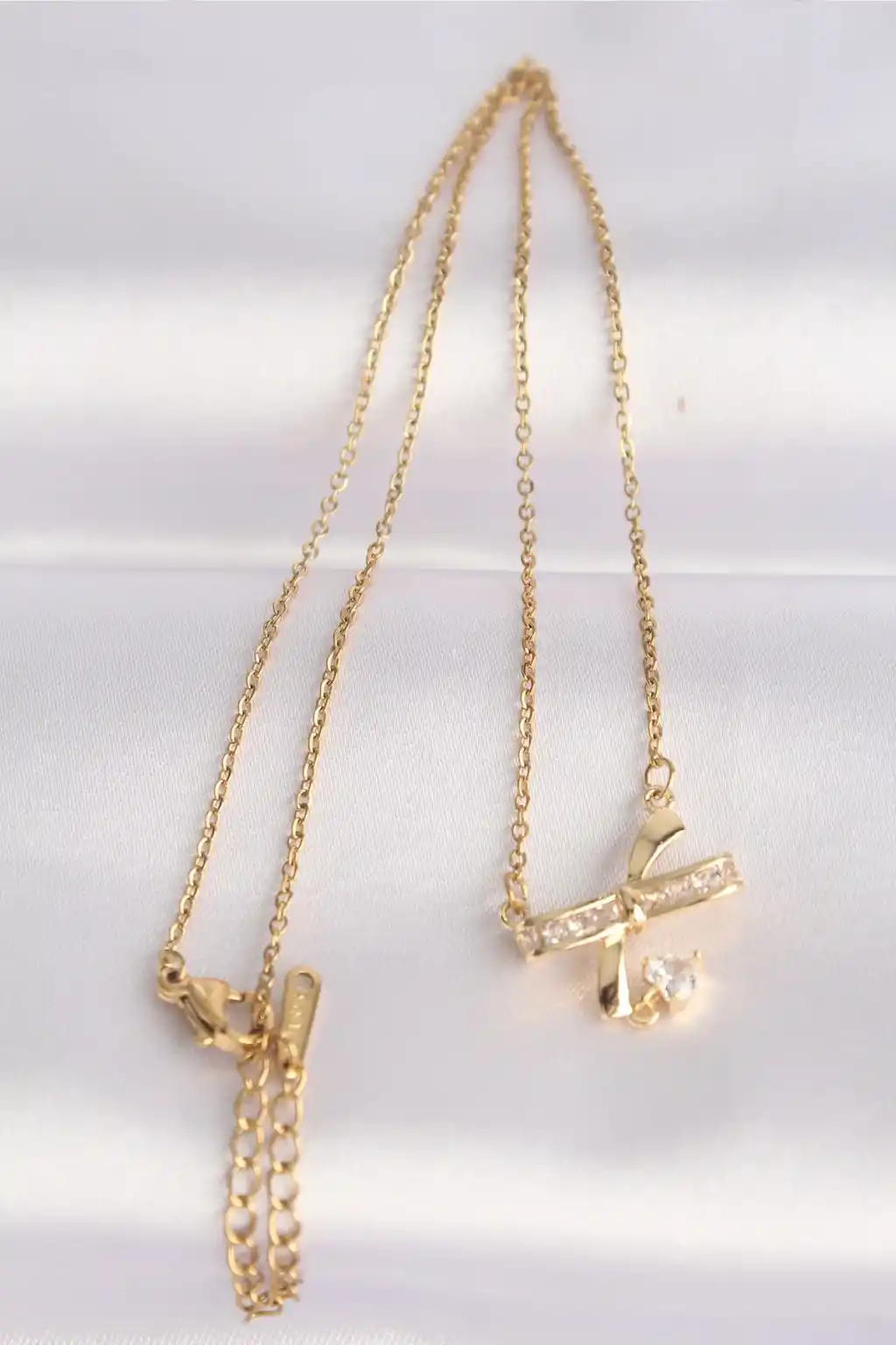 316L Çelik Zincir Altın Renk Zirkon Taşlı Kalp Detay Fiyonk Kolye