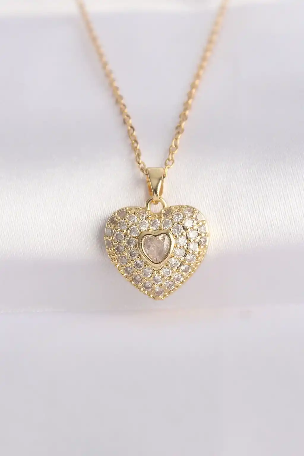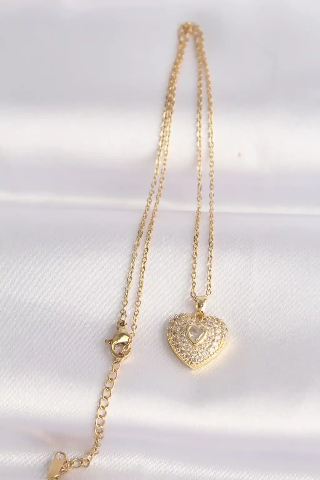 316L Çelik Zincir Altın Renk Zirkon Taşlı Kalp Kolye