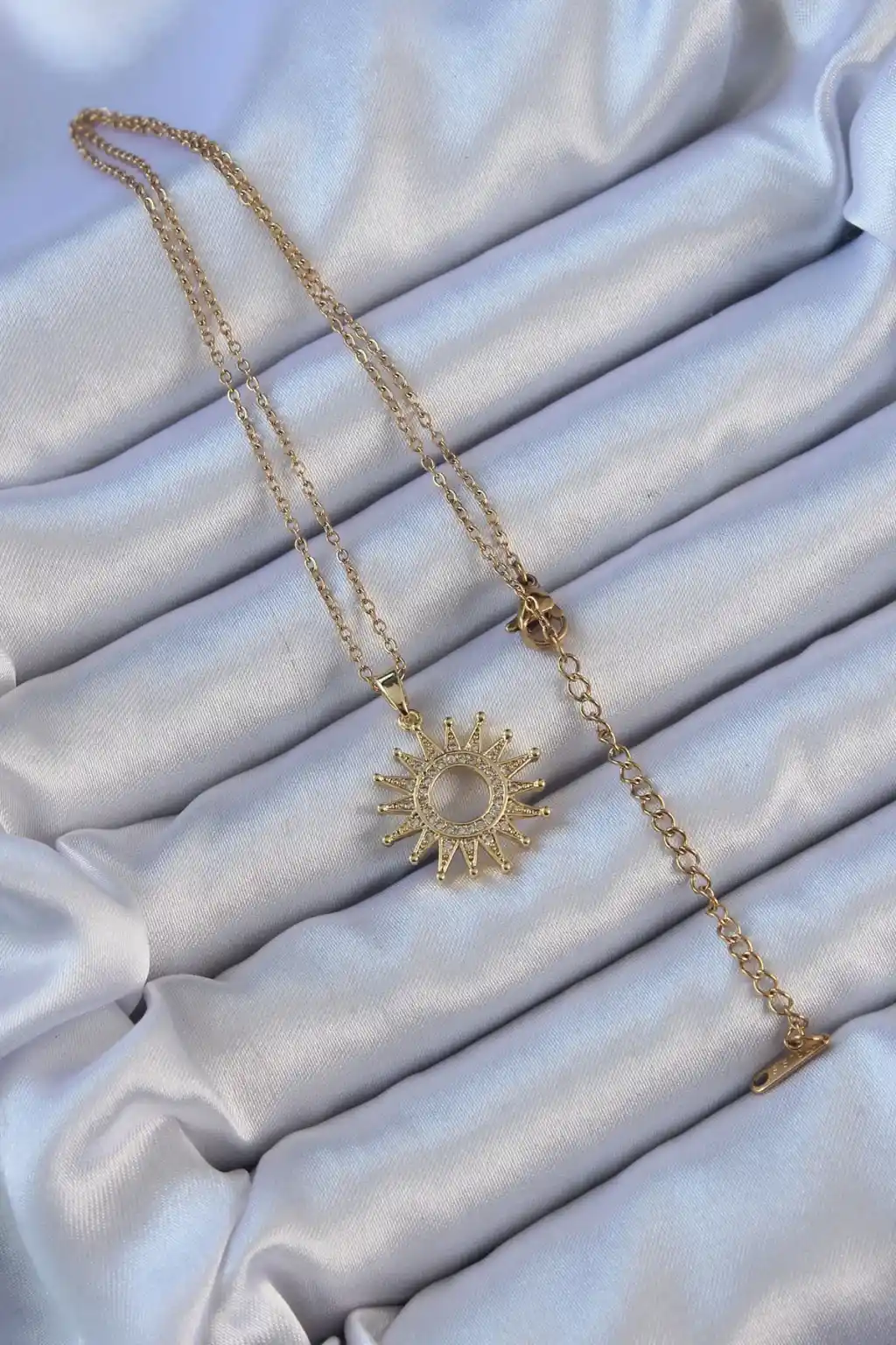 316L Çelik Zincir Altın Renk Zirkon Taşlı Parlayan Güneş Kolye