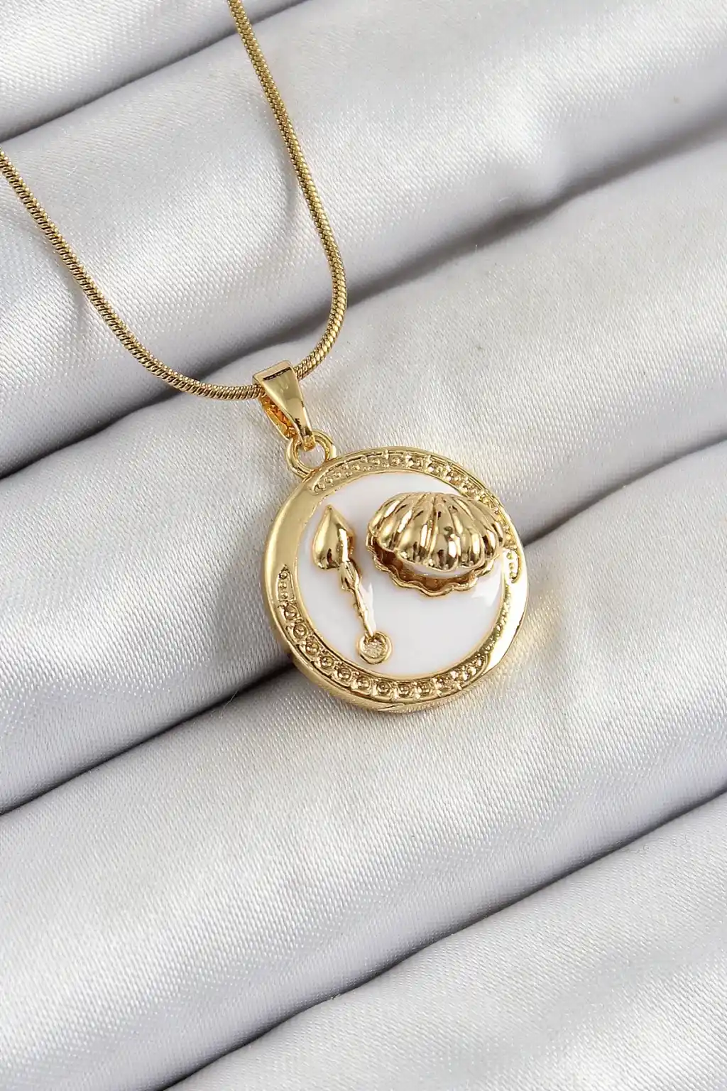 316L Çelik Zincir Beyaz Mineli Sanatsal Portre İstiridye Model Gold Renk Kadın Kolye