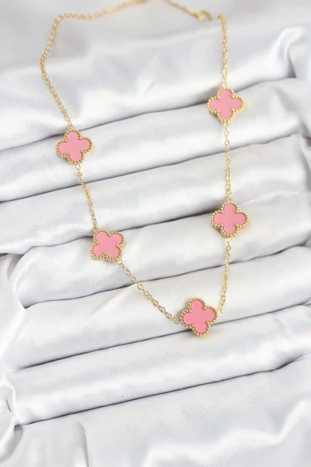 316L Çelik Zincir Gold Pembe Renk Yonca Kadın Kolye
