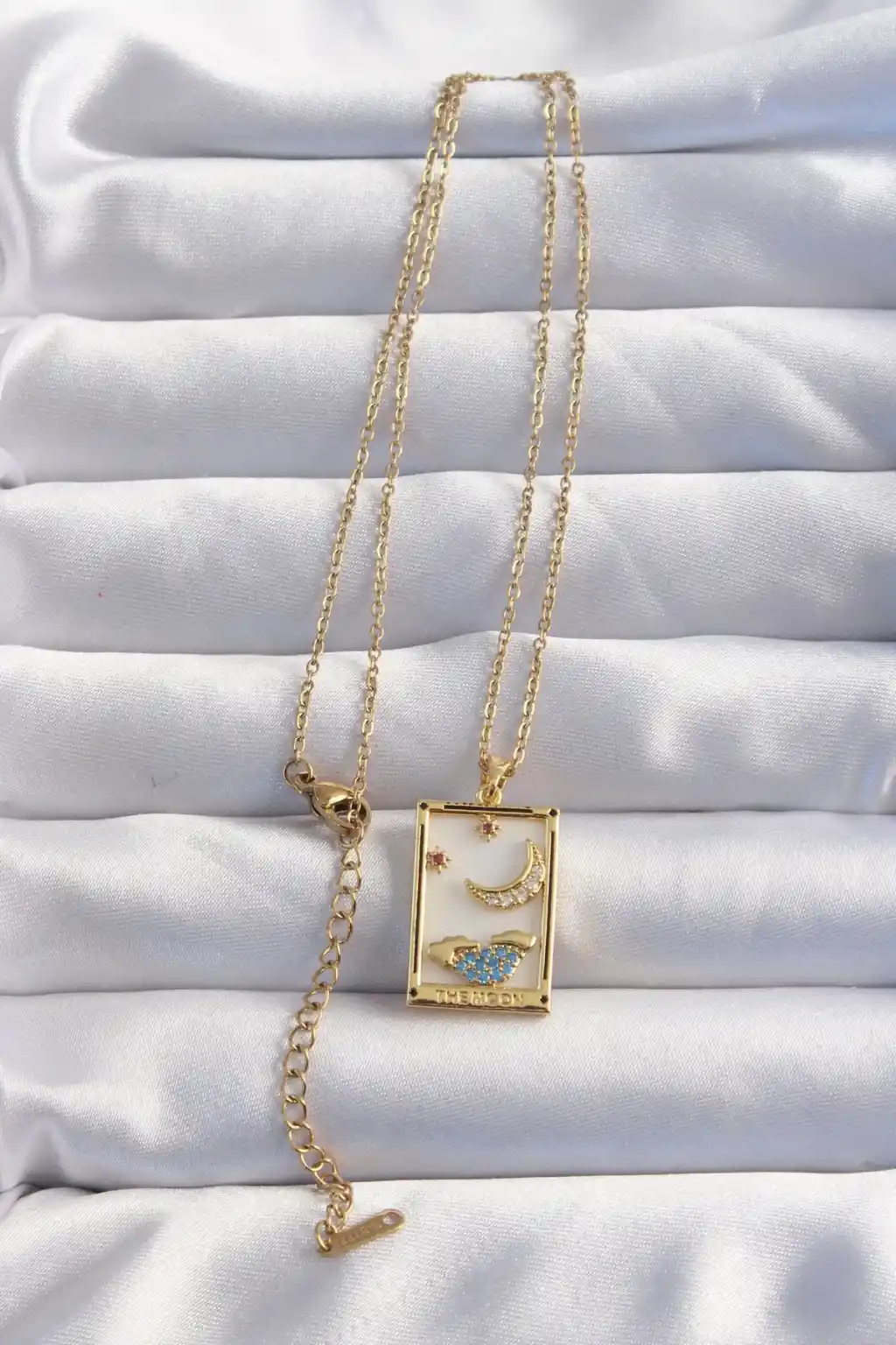 316L Çelik Zincir Gold Renk Ay Detay Mavi Zirkon Taşlı Tarot Kolye