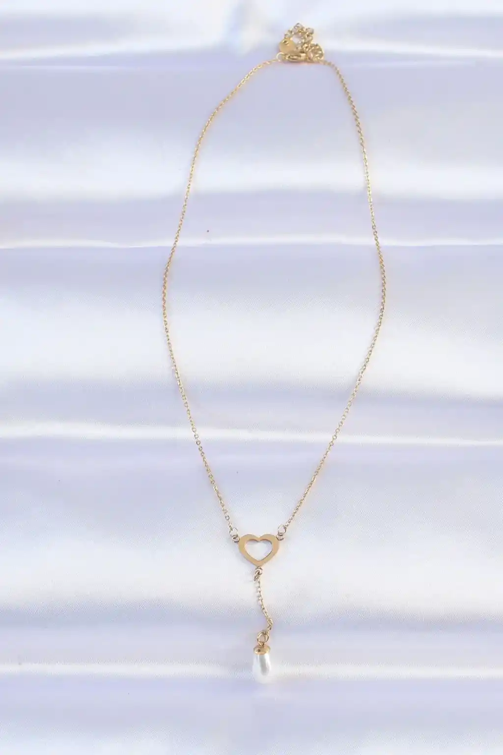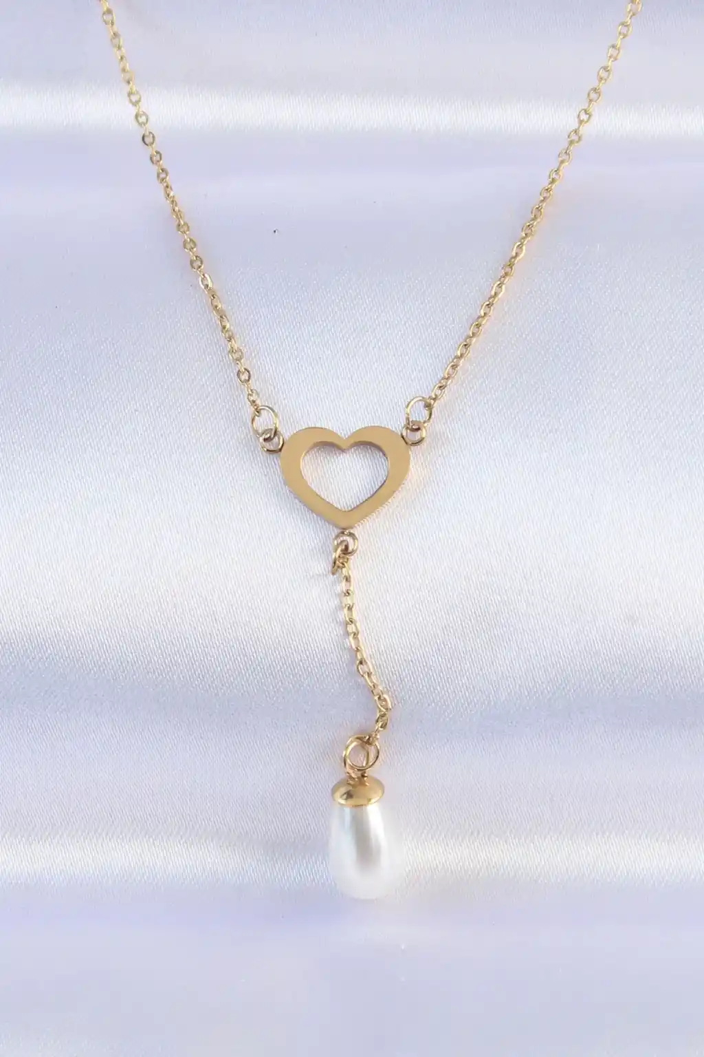 316L Çelik Zincir Gold Renk İnci Taş Detay Kalp Kolye