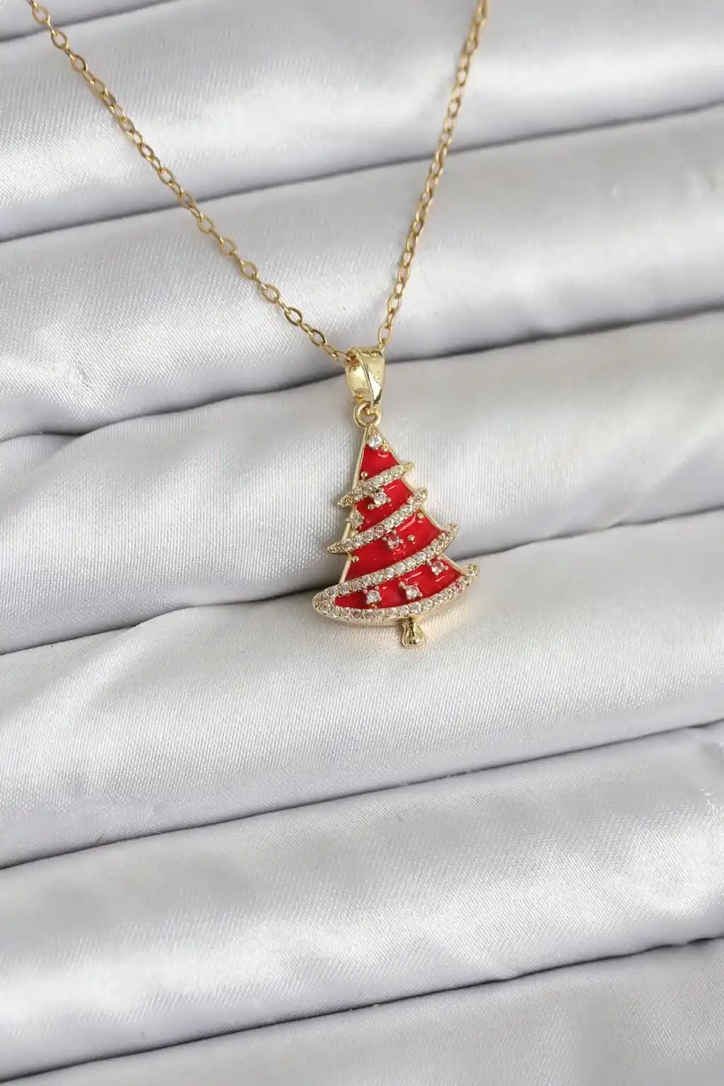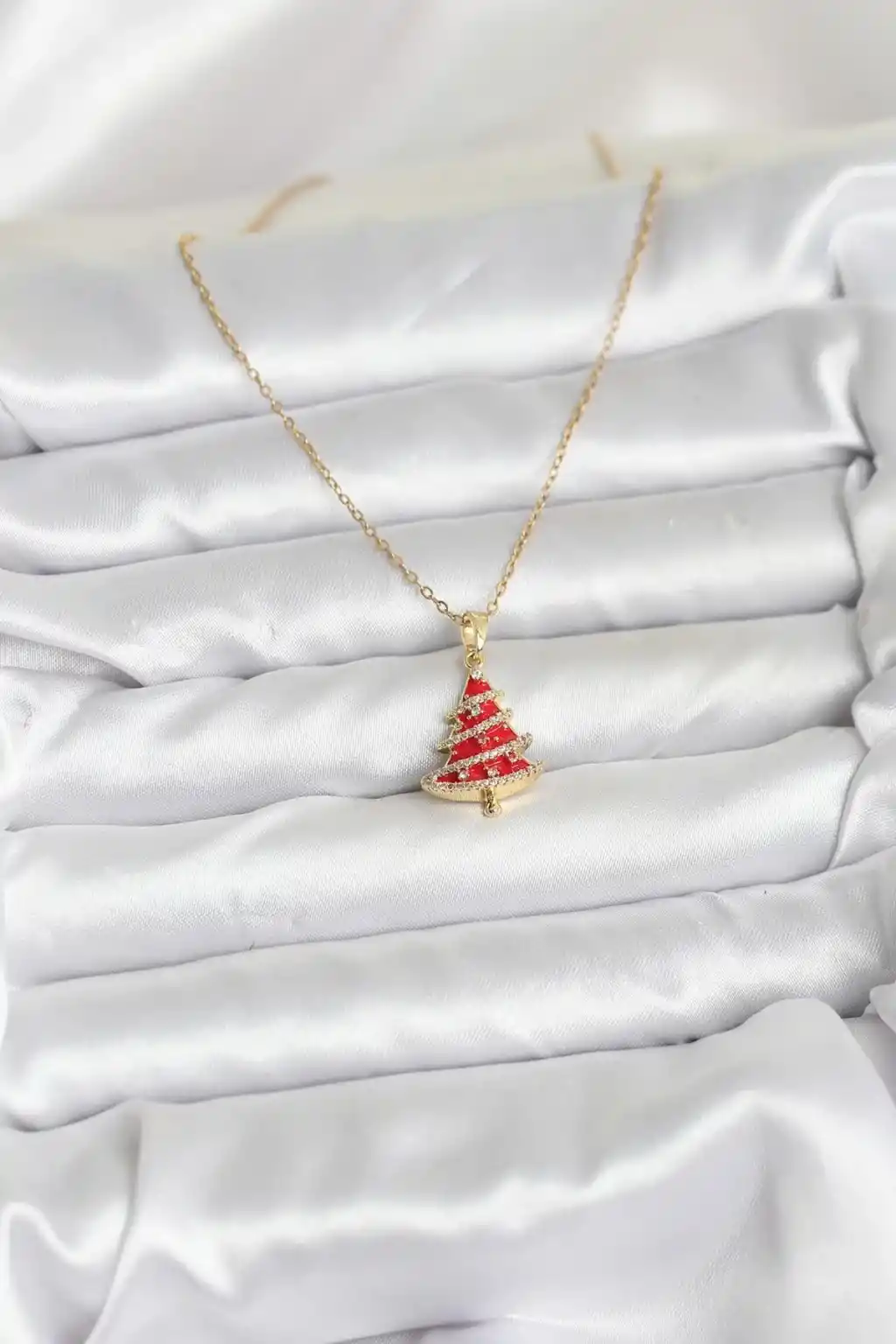 316L Çelik Zincir Gold Renk Kırmızı Çam Ağacı Model Yılbaşı Temalı Kadın Kolye