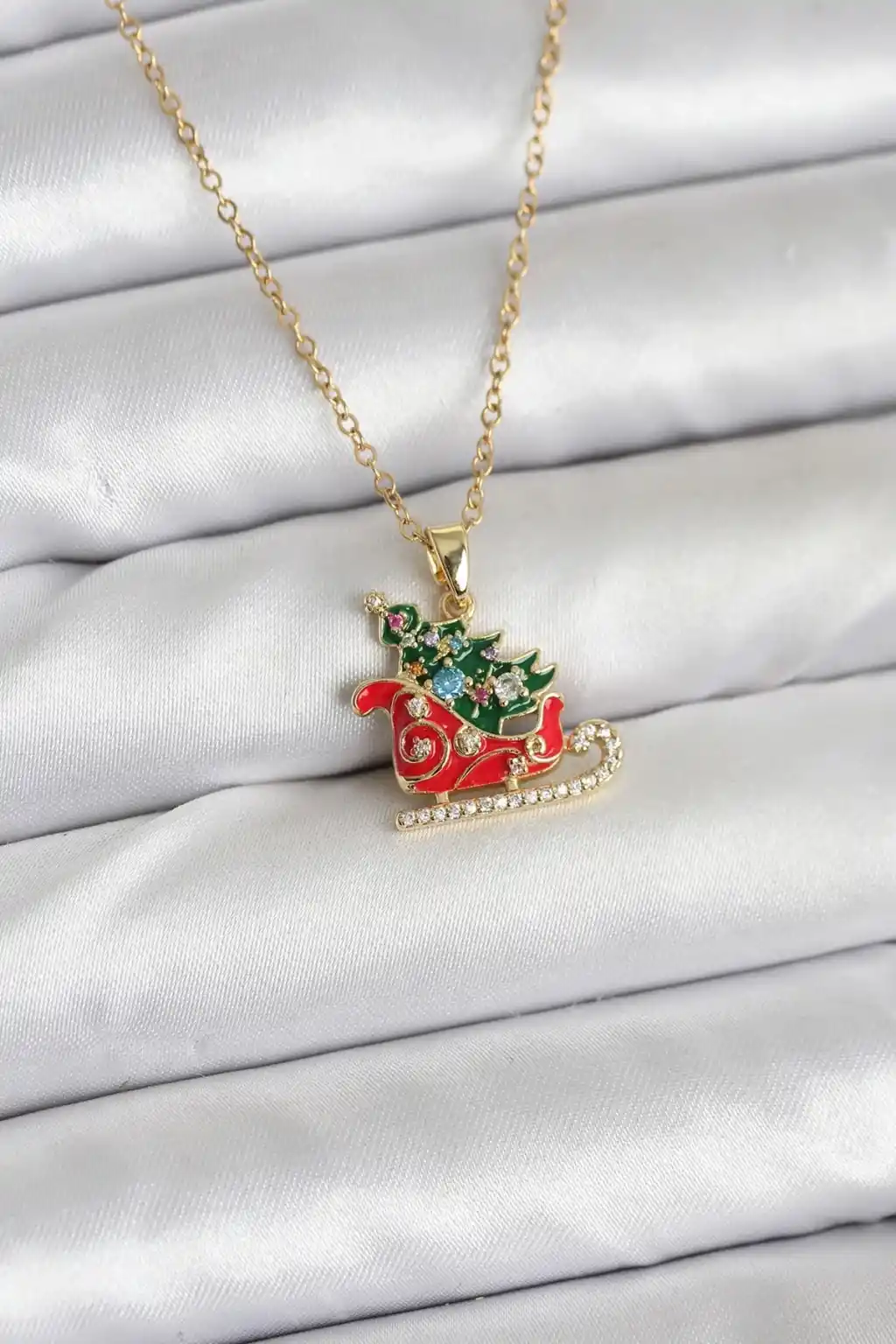 316L Çelik Zincir Gold Renk Kızak ve Çam Ağacı Figürlü Yılbaşı Temalı Kadın Kolye
