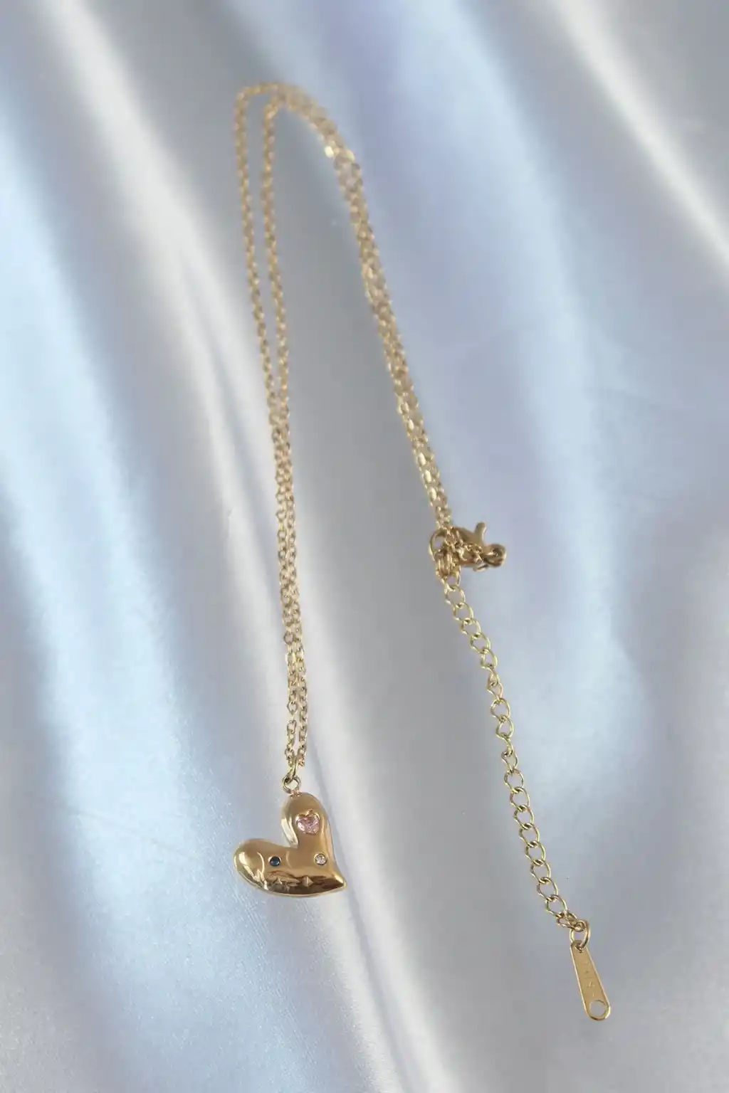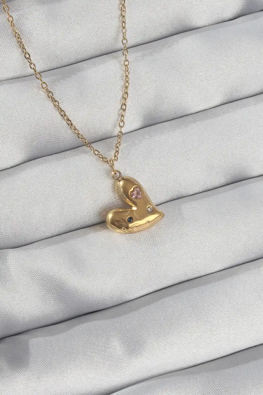 316L Çelik Zincir Gold Renk Renkli Zirkon Taşlı Kalp Kolye