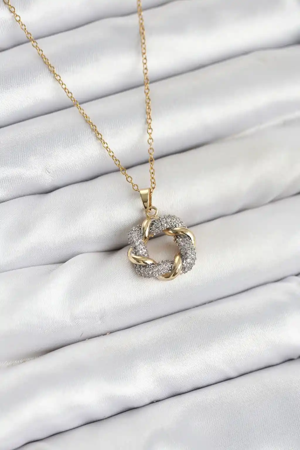 316L Çelik Zincir Gold Renk Zirkon Taşlı Sarmal Model Kadın Kolye