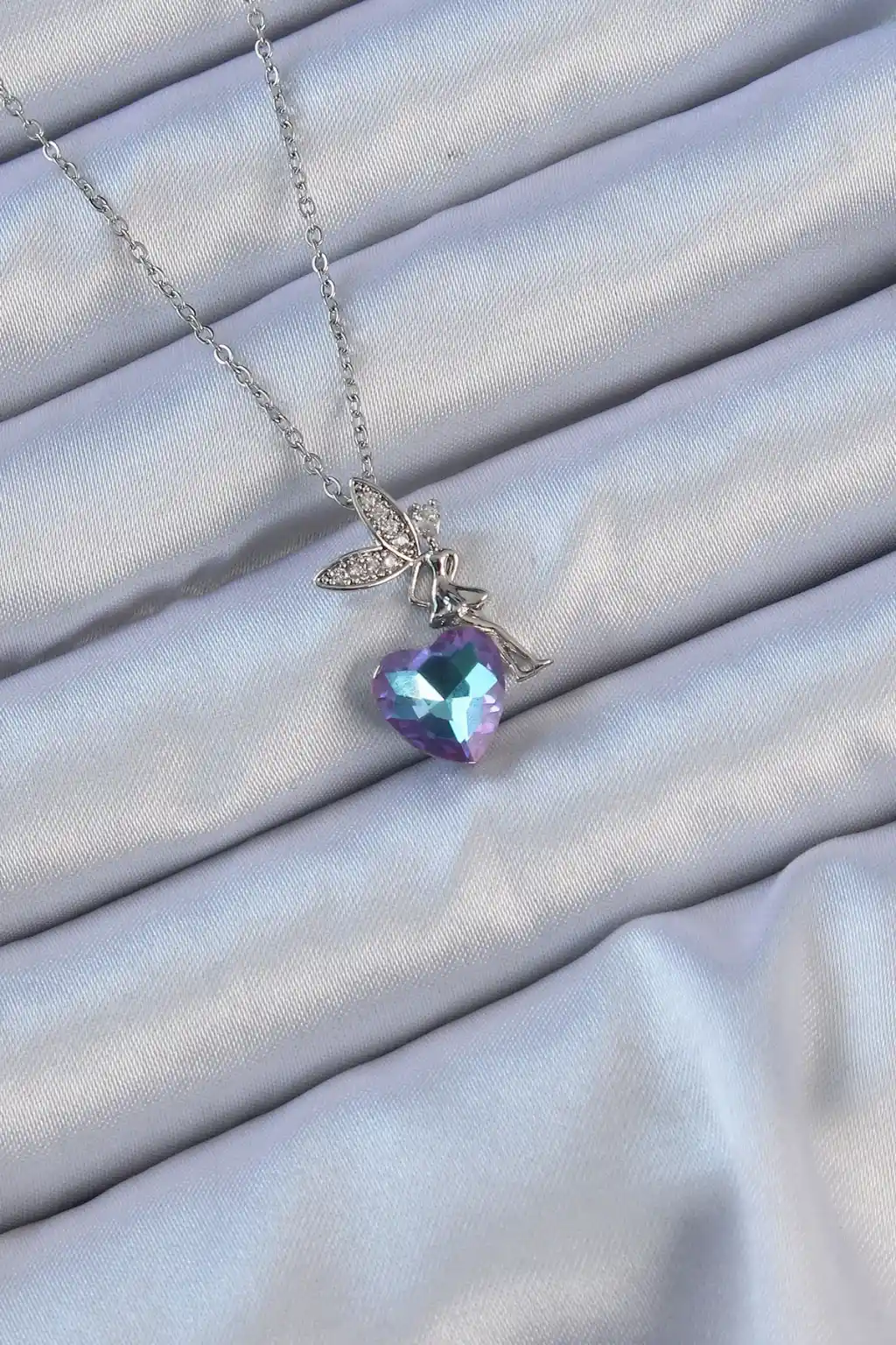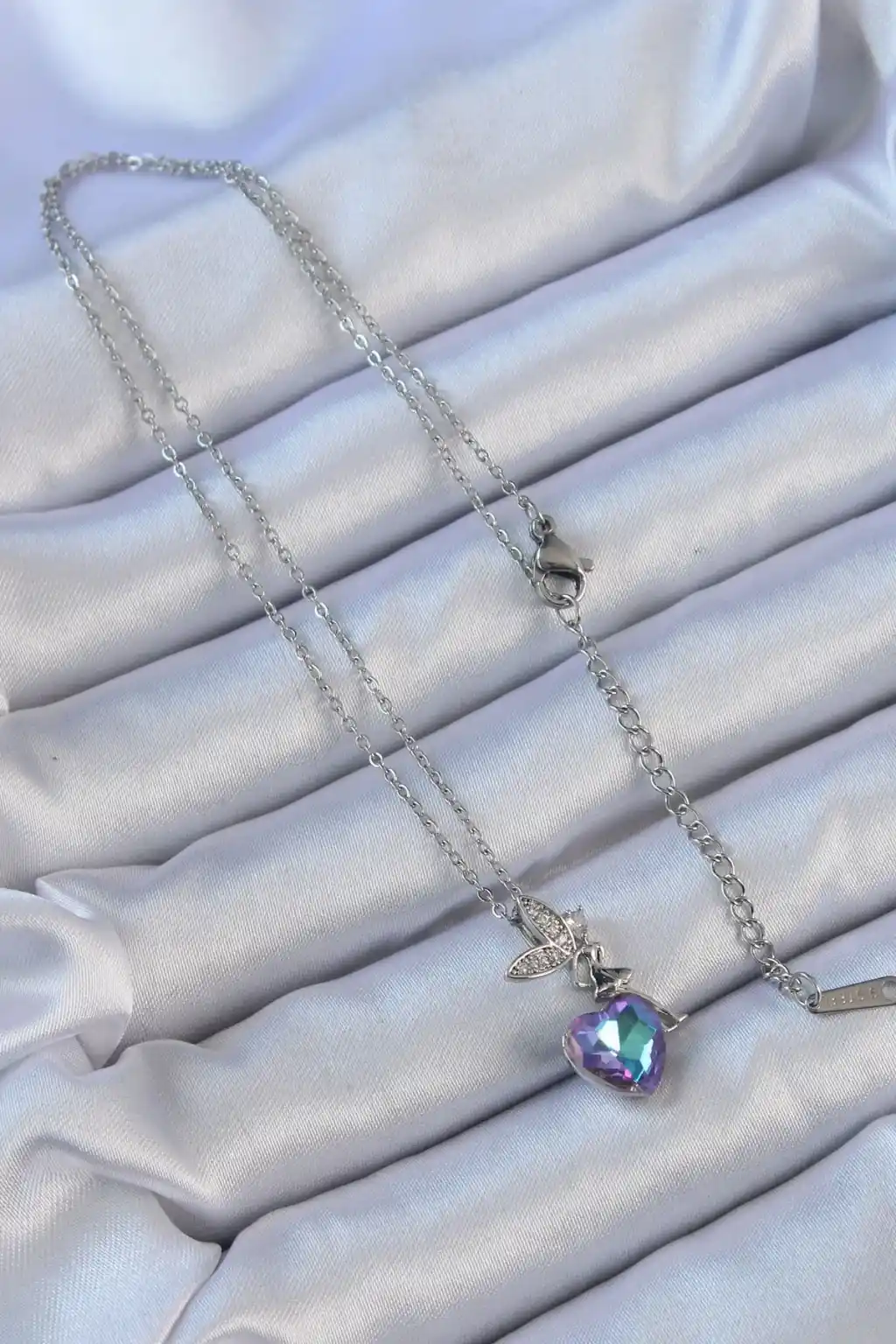 316L Çelik Zincir Gümüş Renk Mor Mavi Renk Zirkon Taşlı Kalp Detay Peri Kolye
