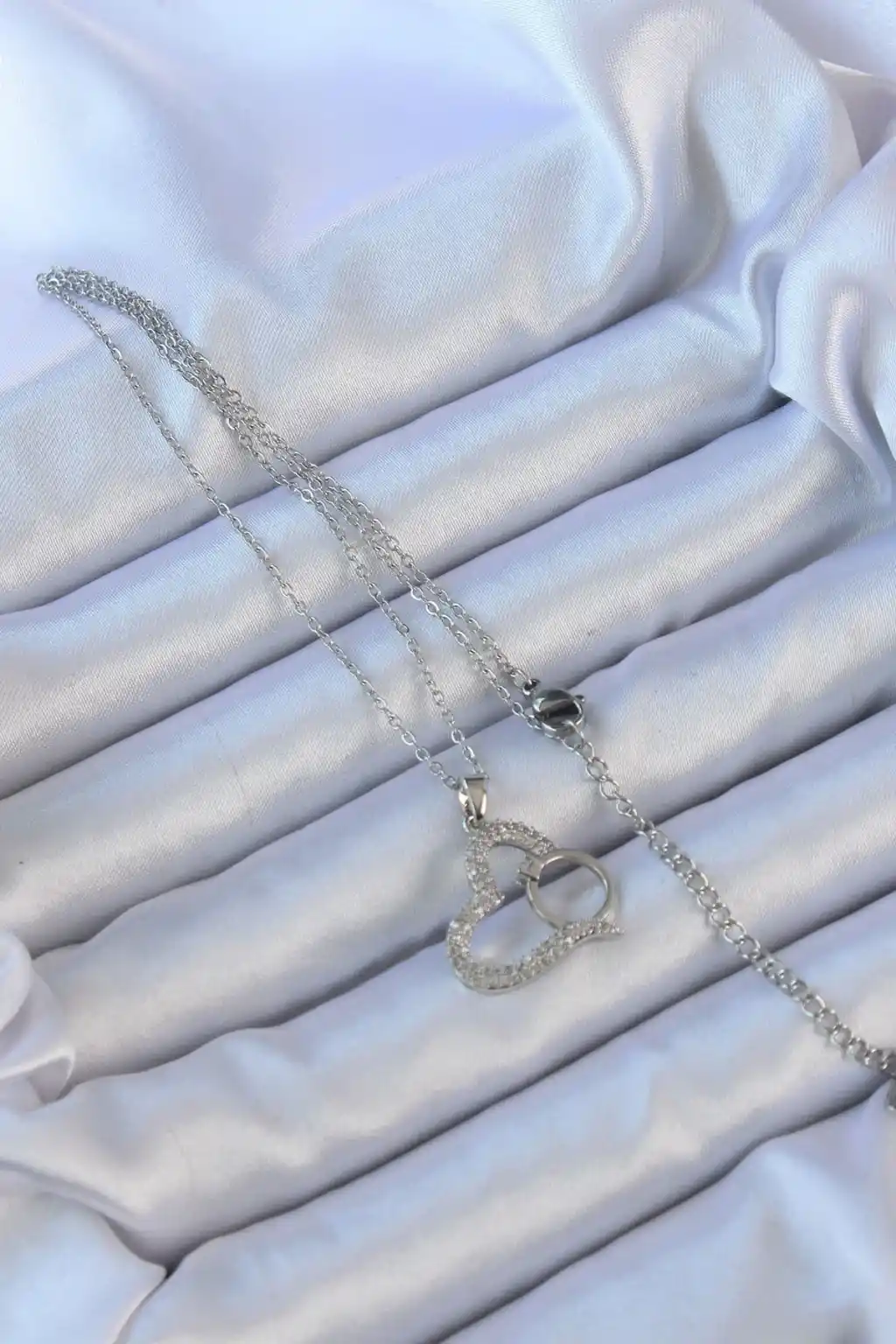 316L Çelik Zincir Gümüş Renk Zirkon Taşlı Yüzüklü Kalp Kolye