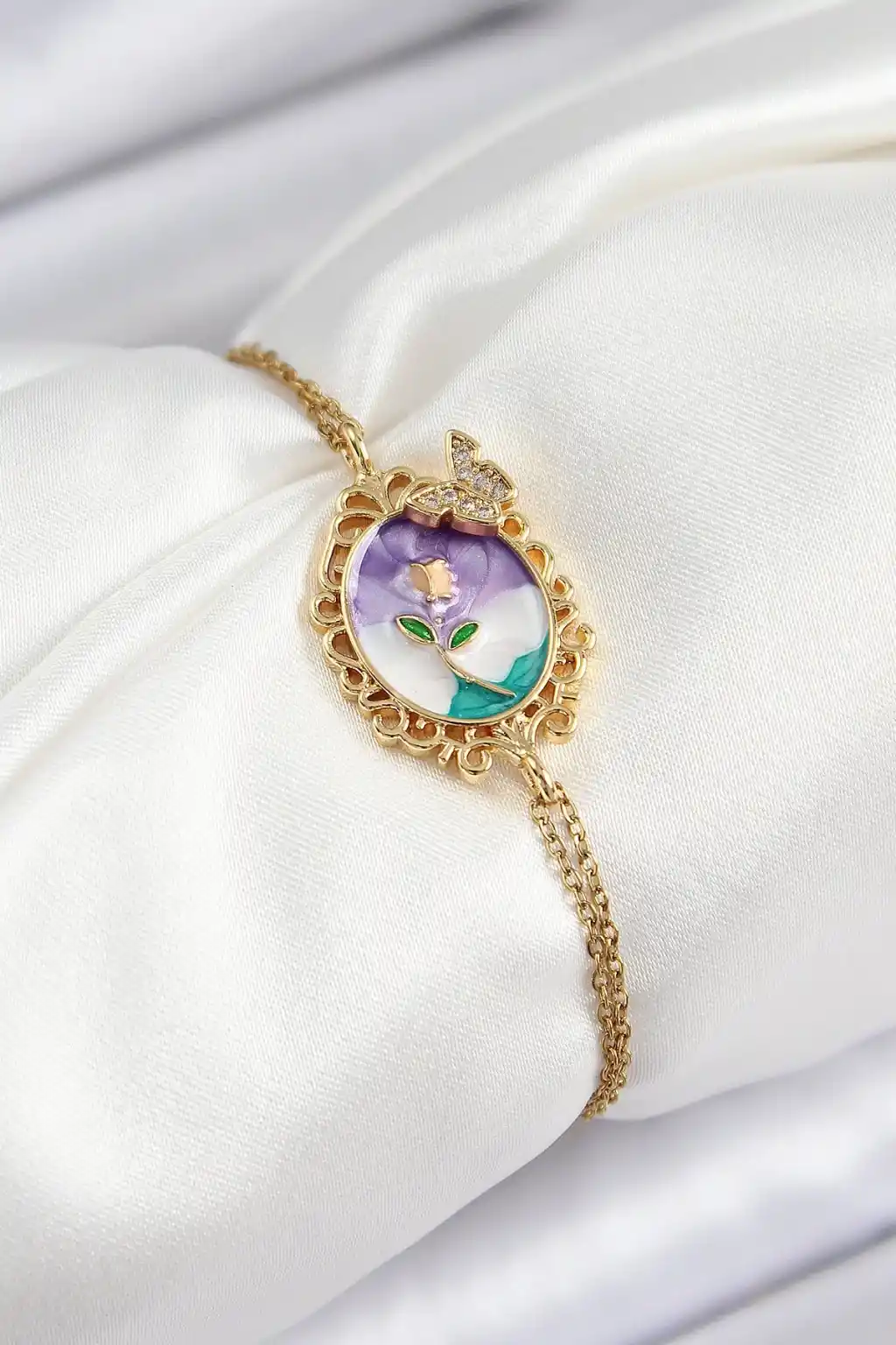 316L Çelik Zincir Mineli Sanatsal Portre Zirkon Taşlı Kelebek Detaylı Çiçek Model Gold Renk Kadın Bileklik