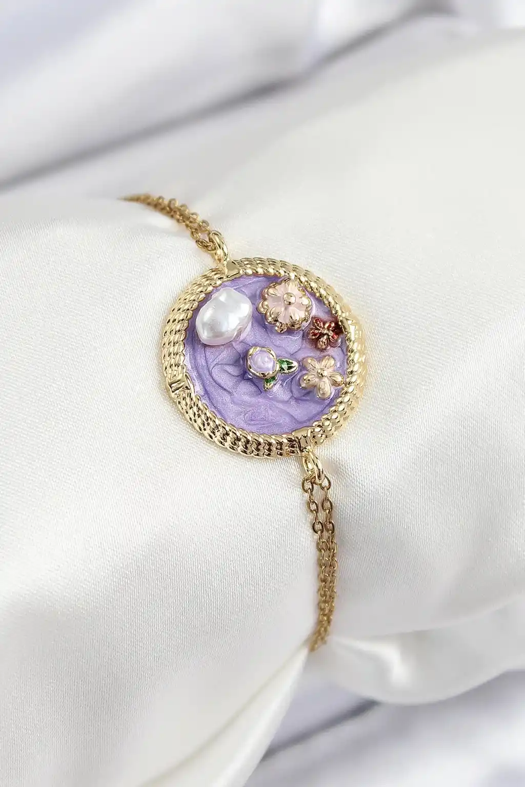 316L Çelik Zincir Mor Mineli Sanatsal Portre İnci Detaylı Çiçek Model Gold Renk Kadın Bileklik