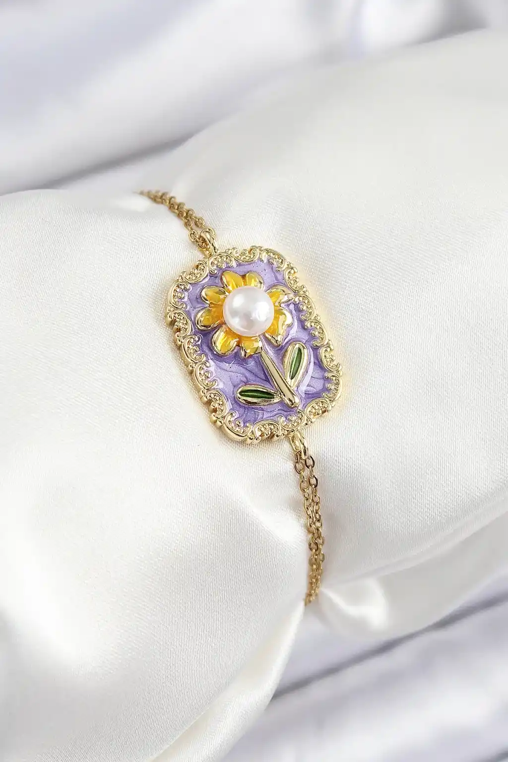 316L Çelik Zincir Mor Mineli Sanatsal Portre İnci Detaylı Papatya Model Gold Renk Kadın Bileklik
