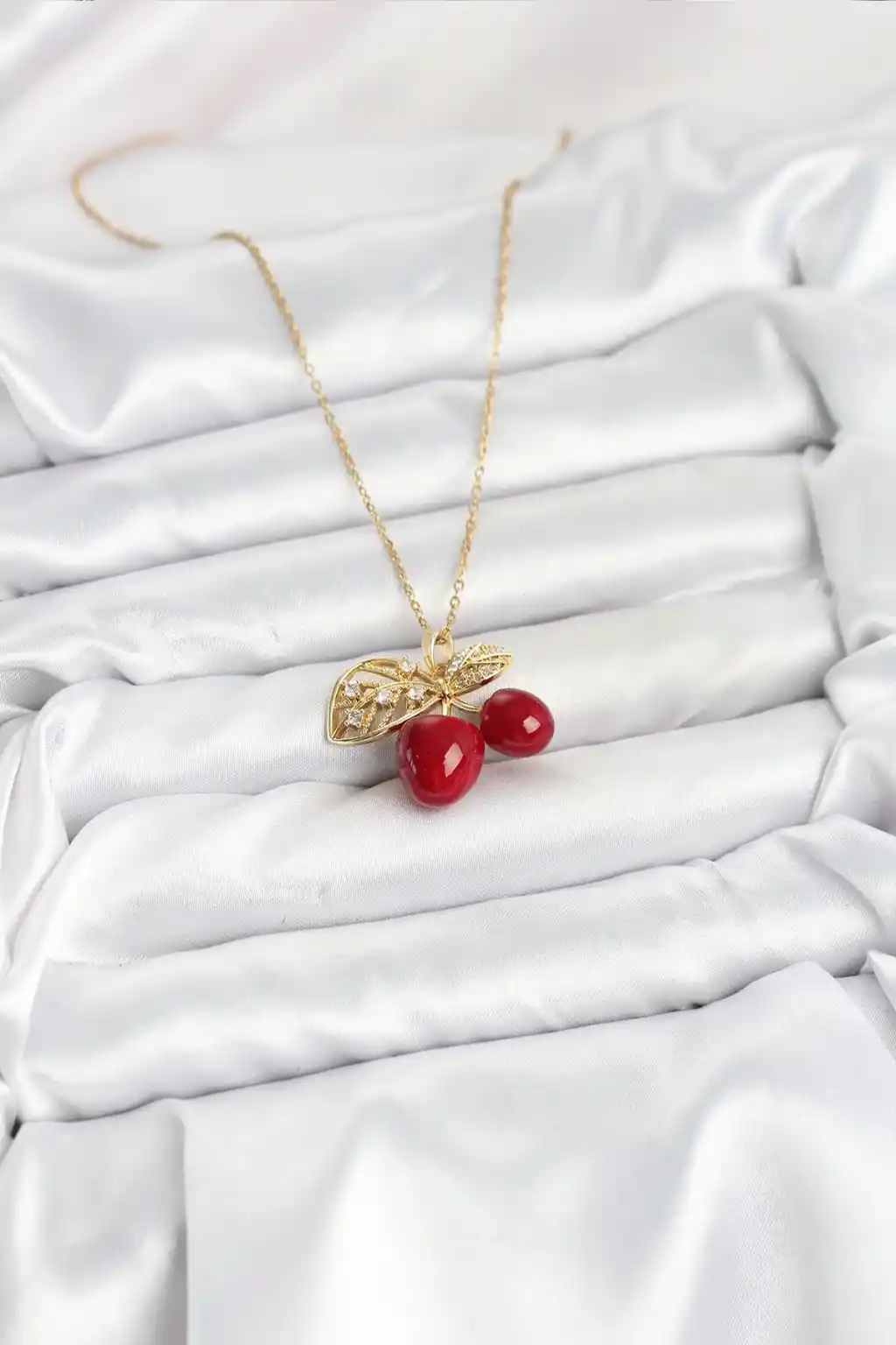 316L Çelik Zincir Yapraklı Kiraz Model Gold Renk Kadın Kolye