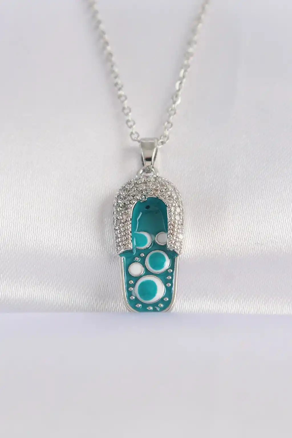 316L Çelik Zincir Zirkon Taşlı Gümüş Renk Nazarlı Terlik Tasarımlı Kolye