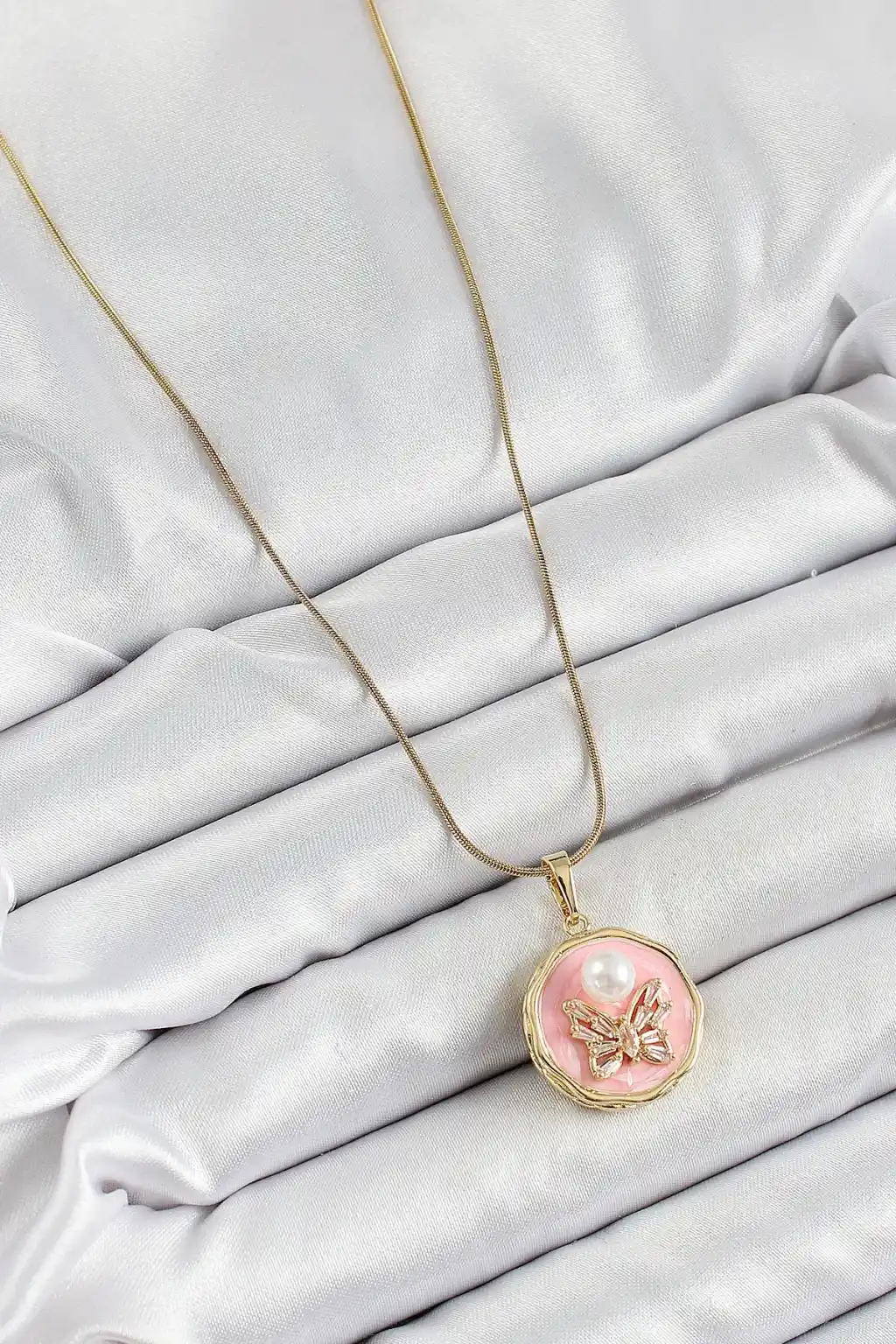 316L Çelik Zincir Zirkon Taşlı Pembe Sanatsal Portre İnci Detaylı Kelebek Model Gold Renk Kadın Kolye