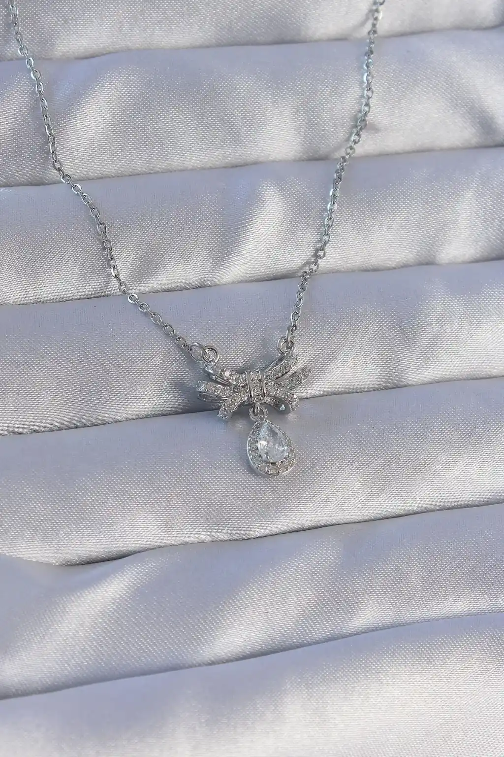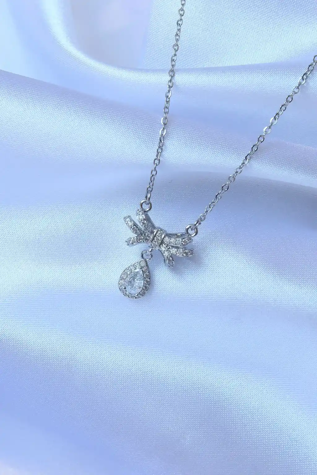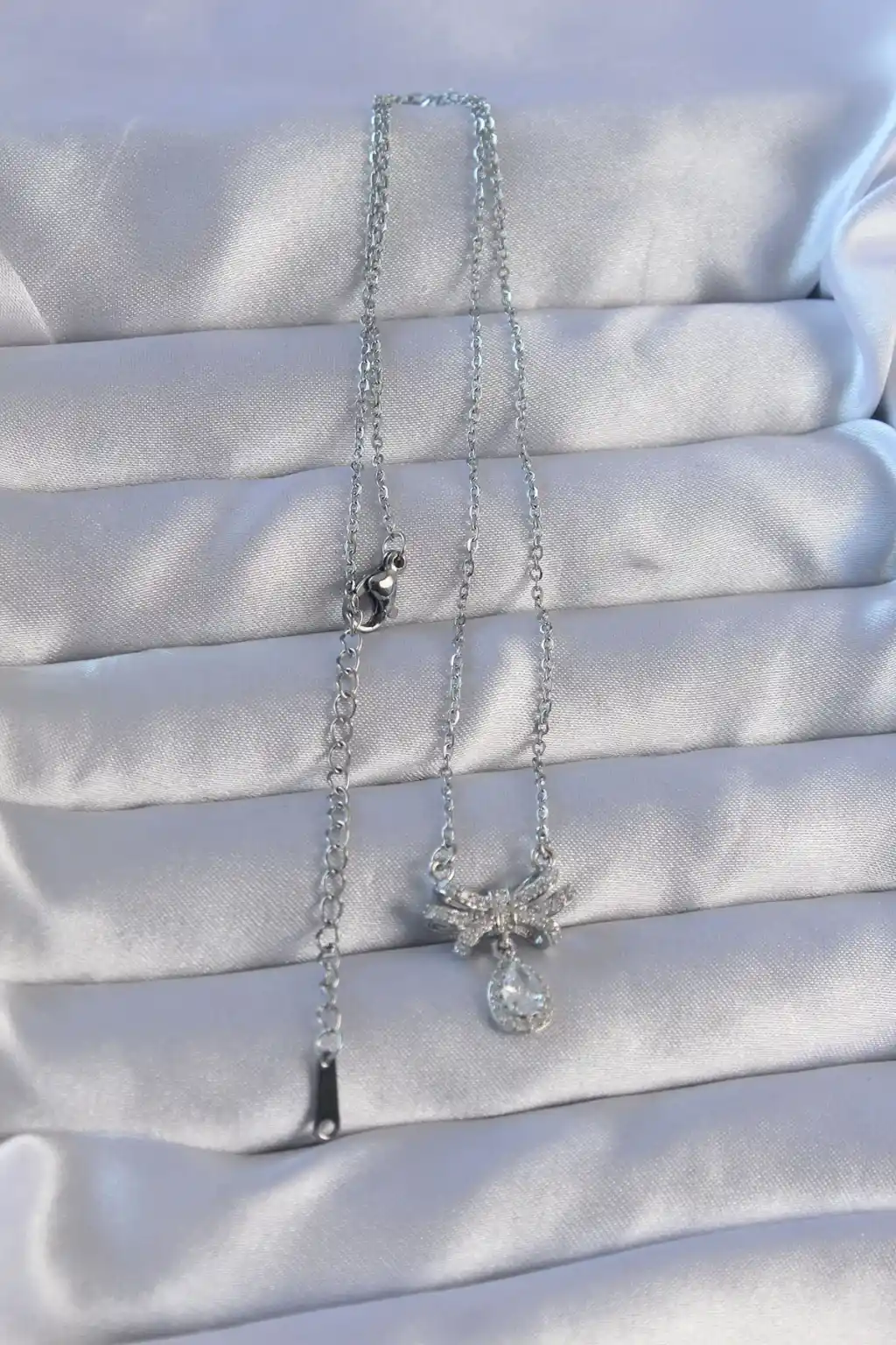 316L Çelik Zincirli Gümüş Renk Zirkon Taşlı Damla Detay Fiyonk Model Kolye
