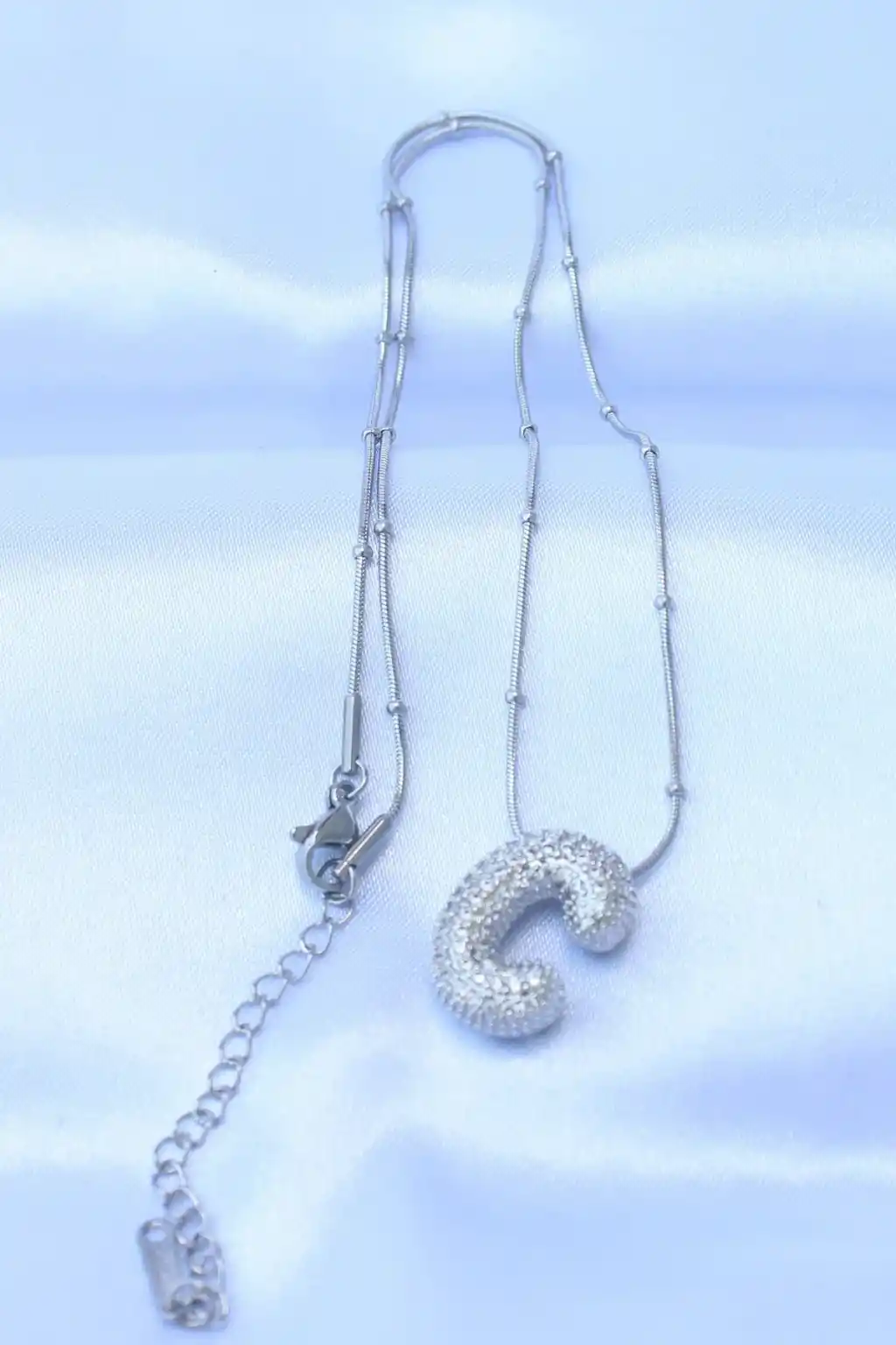 316L Çelik Zincirli Zirkon Taşlı C Harfli Gümüş Renk Bubble Kolye