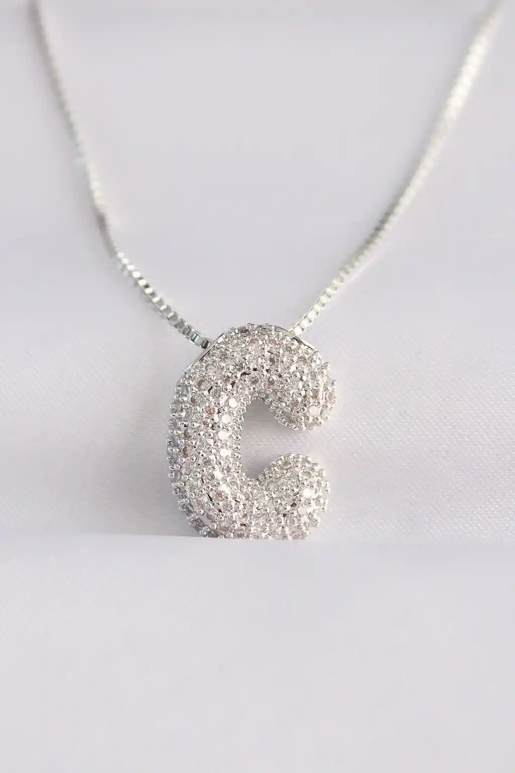 316L Çelik Zincirli Zirkon Taşlı C Harfli Silver Renk Bubble Kolye