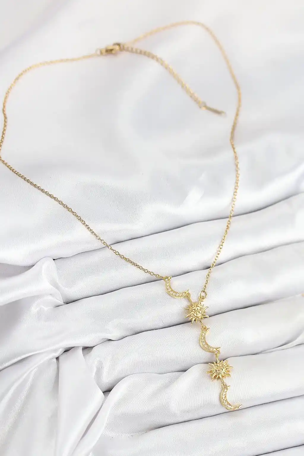 316L Çelik Zirkon Taşlı Güneş Ve Ay Model Gold Renk Kadın Kolye