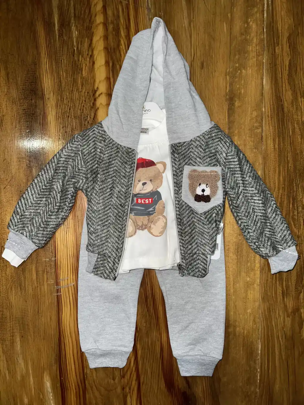 6-24 aylık ceketli kapşonlu üçlü takım gribeyaz