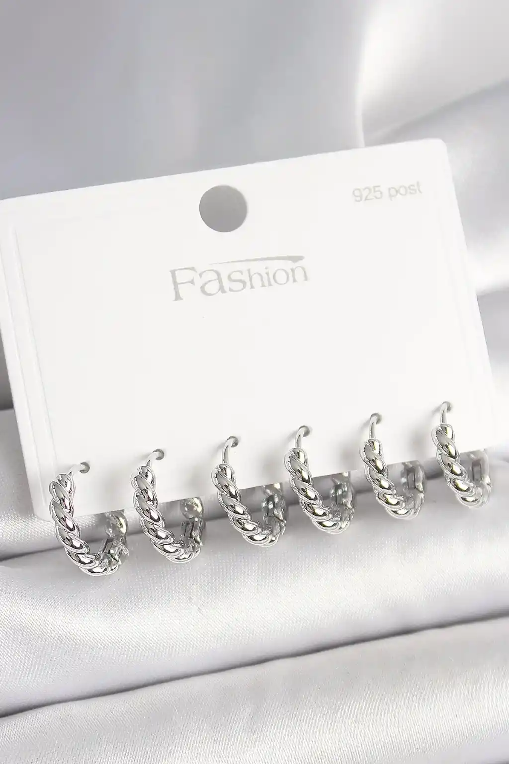 925 Ayar Gümüş Çivi Pirinç Gümüş Renk Sarmal Halka Model Kadın Küpe Seti