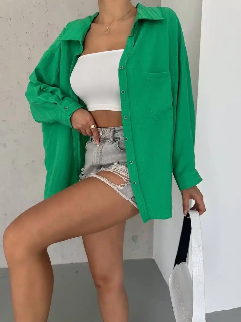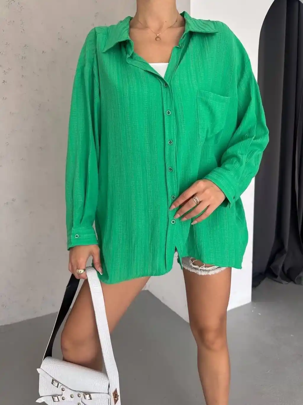 KAZAX marka ağaç kabuğu desenli oversize gömlek, şıklık ve rahatlığı bir arada sunuyor.