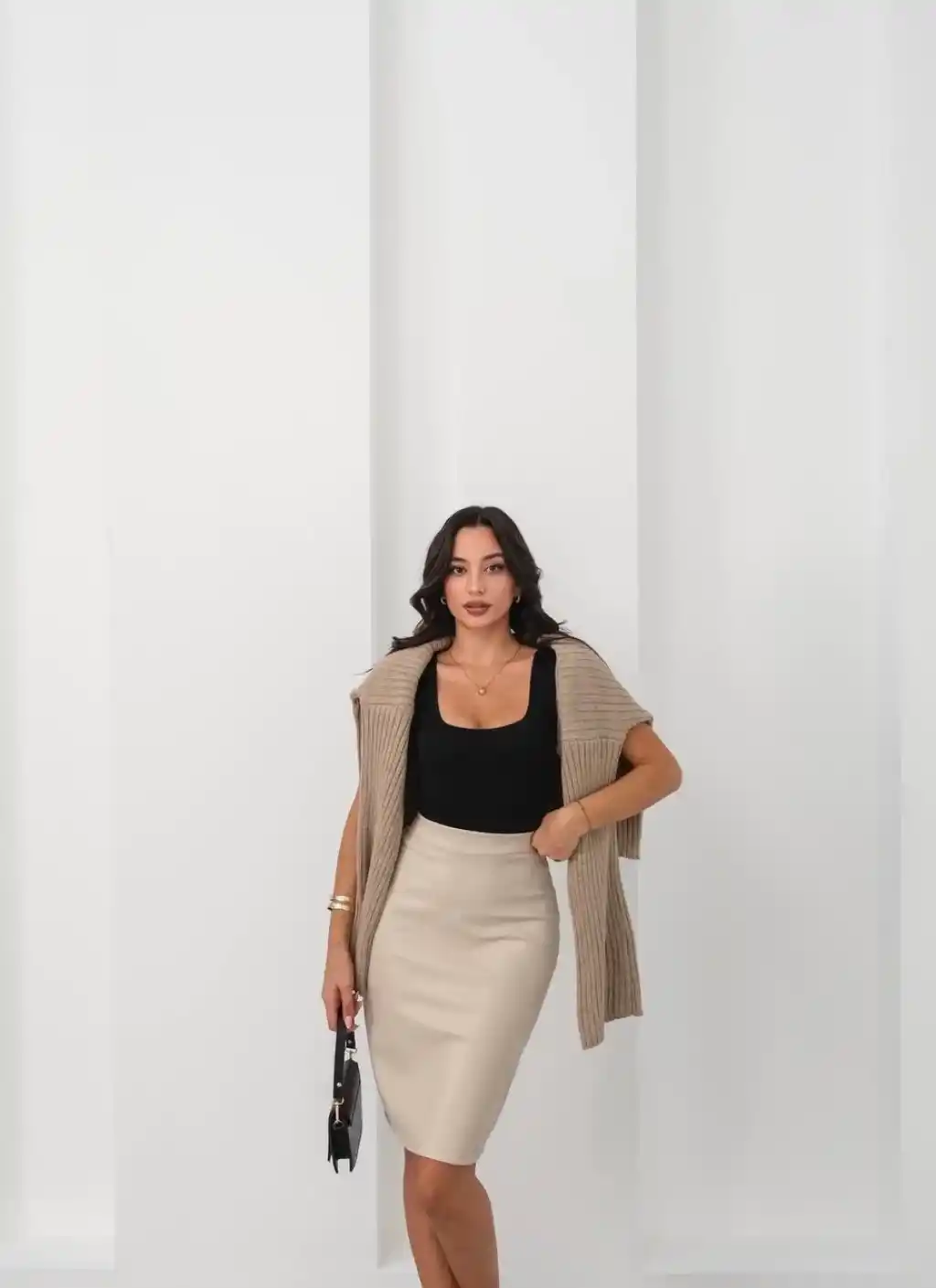 Arkadan yırtmaçlı kalem etek bej, şıklığı ve zarafeti bir arada sunar. Hem günlük kullanıma uygun hem de özel davetlerde tercih edilebilecek bir parçadır.