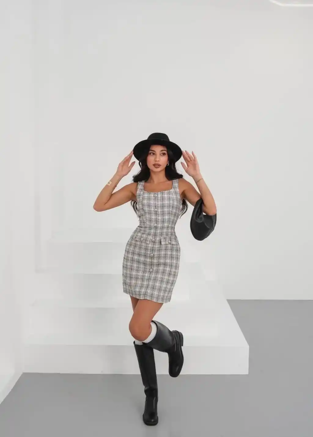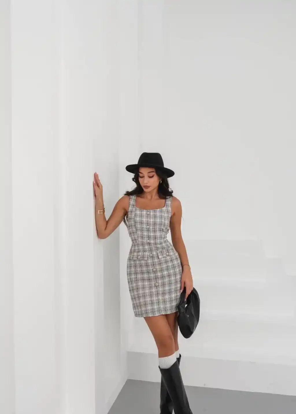 Askılı ch kumaş düğmeli elbise gribeyaz h265007