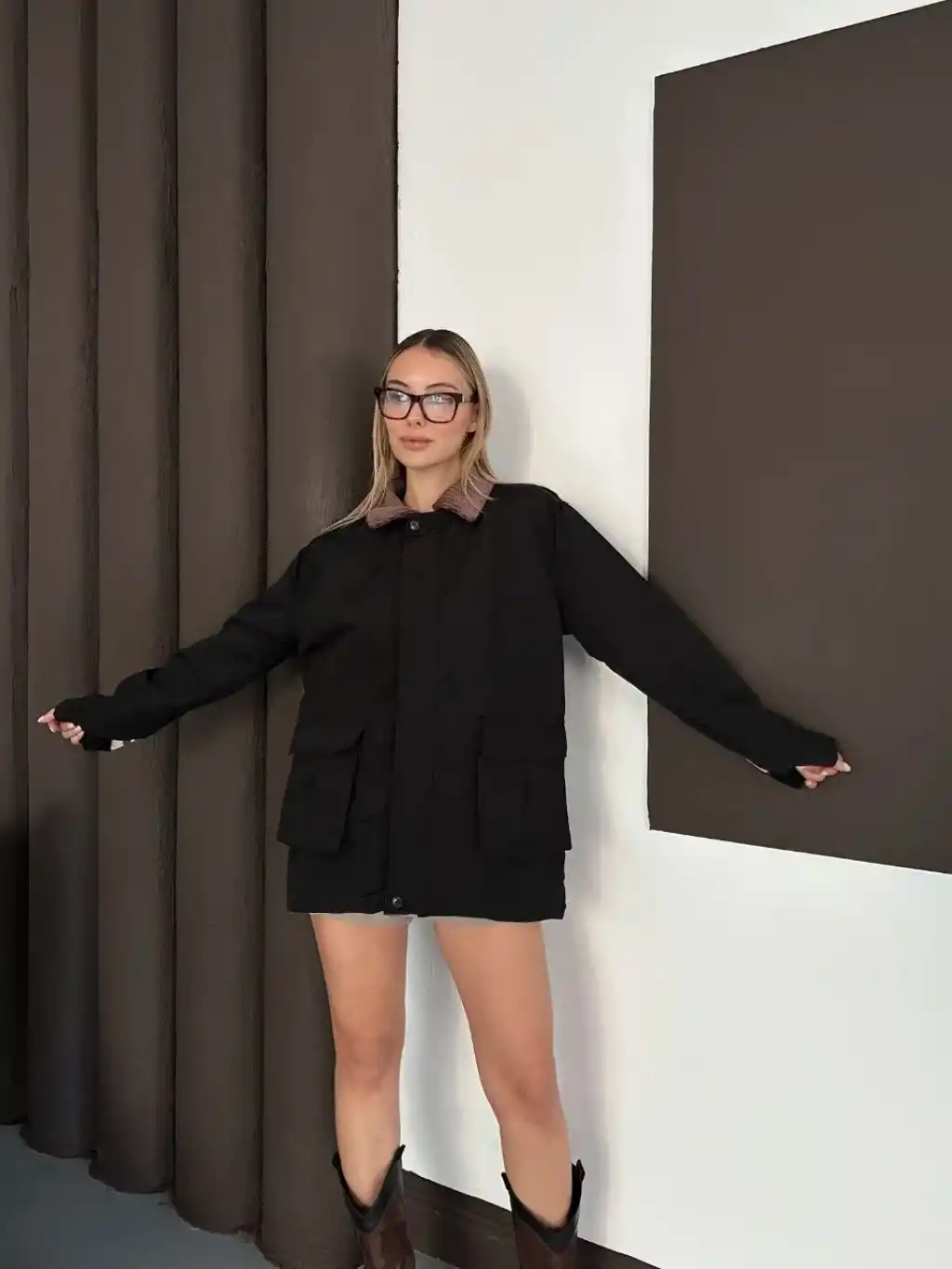Astarlı yaka detaylı artos ceket siyah st2651019