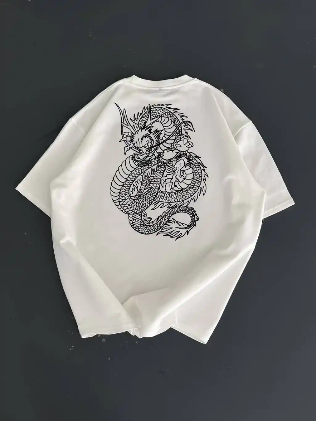 20/1 Penye Compack Ön Arka Ejder Baskılı Oversize Bisiklet Yaka T-shirt - Beyaz