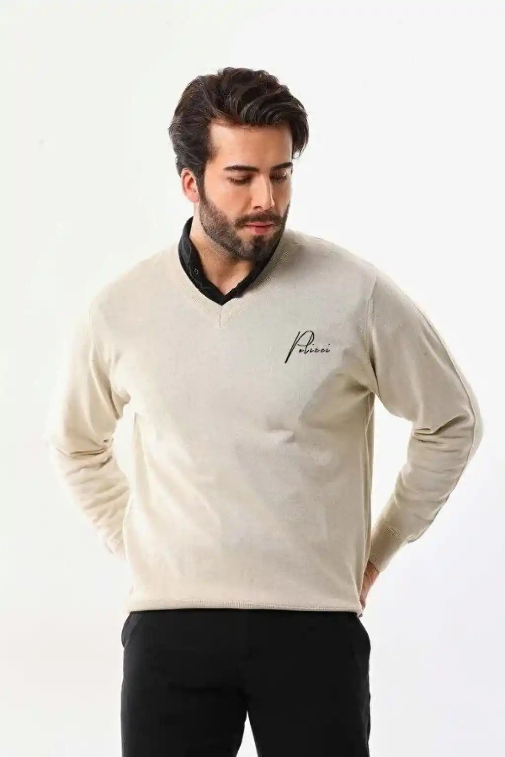 Baskılı V Yaka Uzun Kol Dokuma Triko - Bej