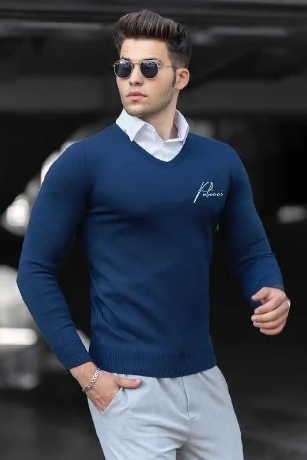 Baskılı V Yaka Uzun Kol Dokuma Triko - Indigo