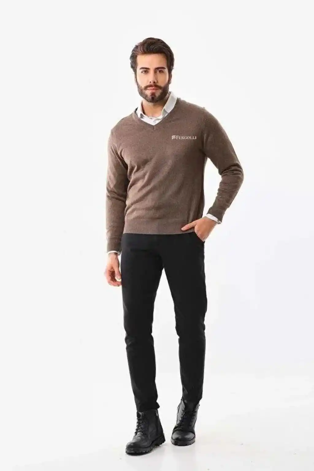 Baskılı V Yaka Uzun Kol Dokuma Triko - Kahve