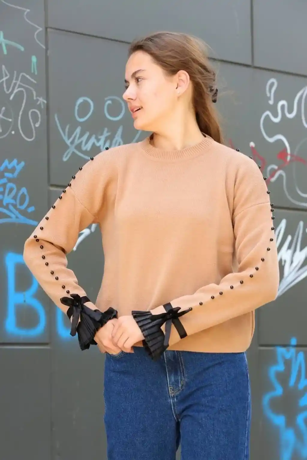 Boncuk detaylarıyla hareketlendirilen kol uçları, klasik kazak tasarımına modern bir dokunuş katıyor.