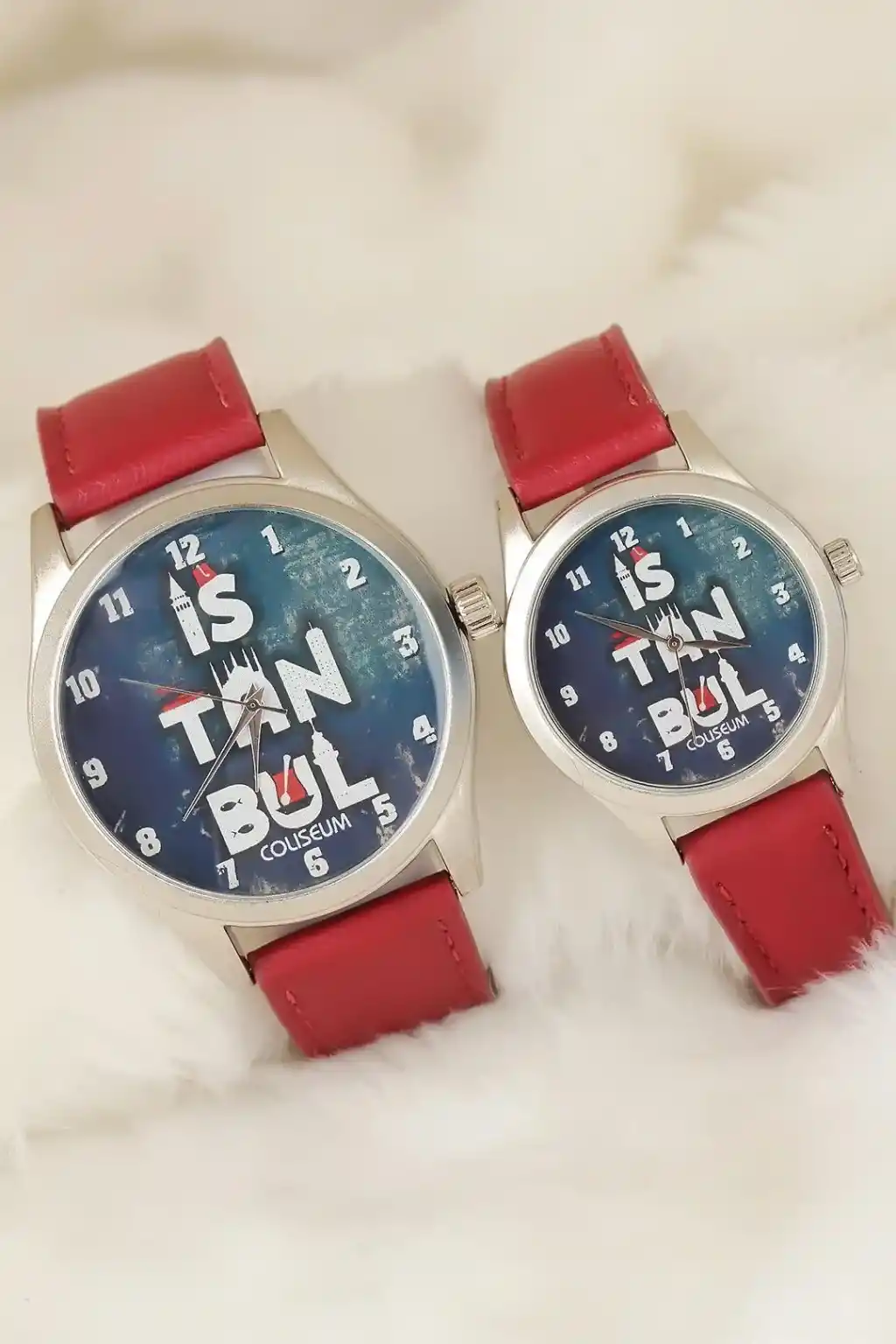 Bordo Renk Deri Kordonlu İstanbul Tasarımlı Sevgili Saatleri