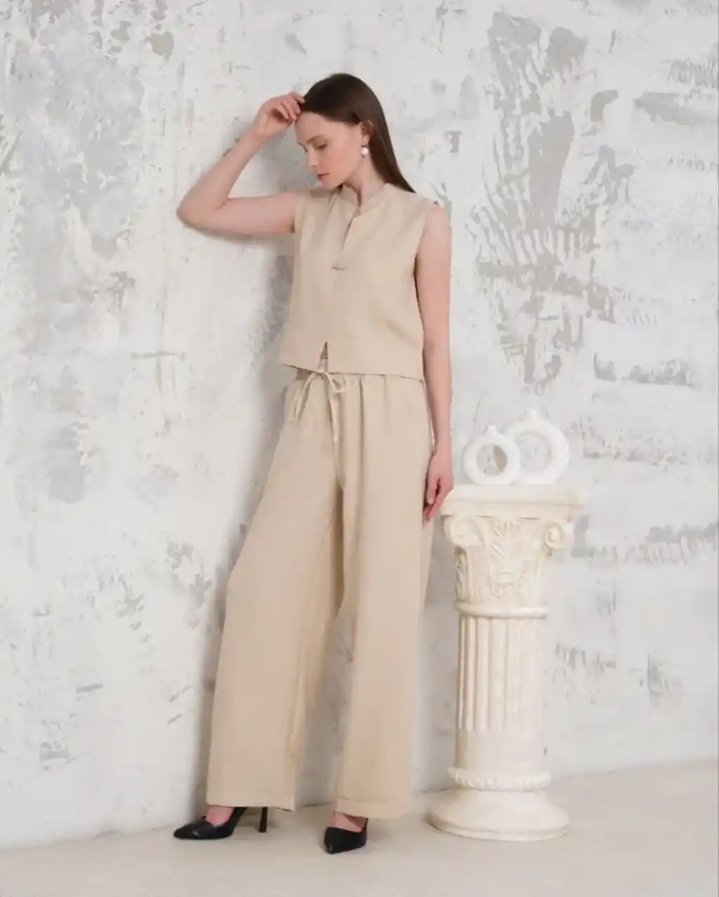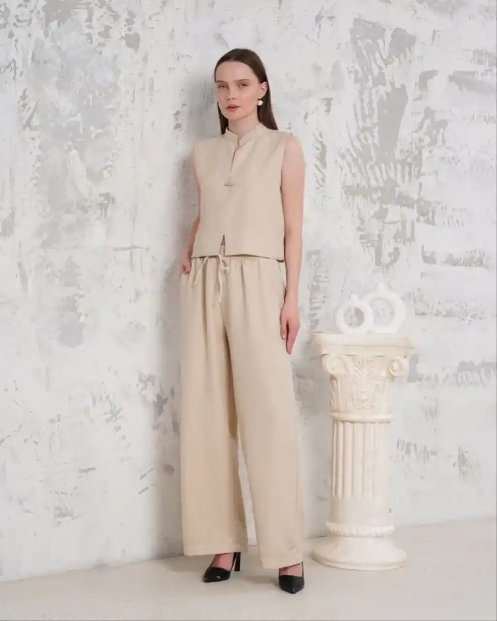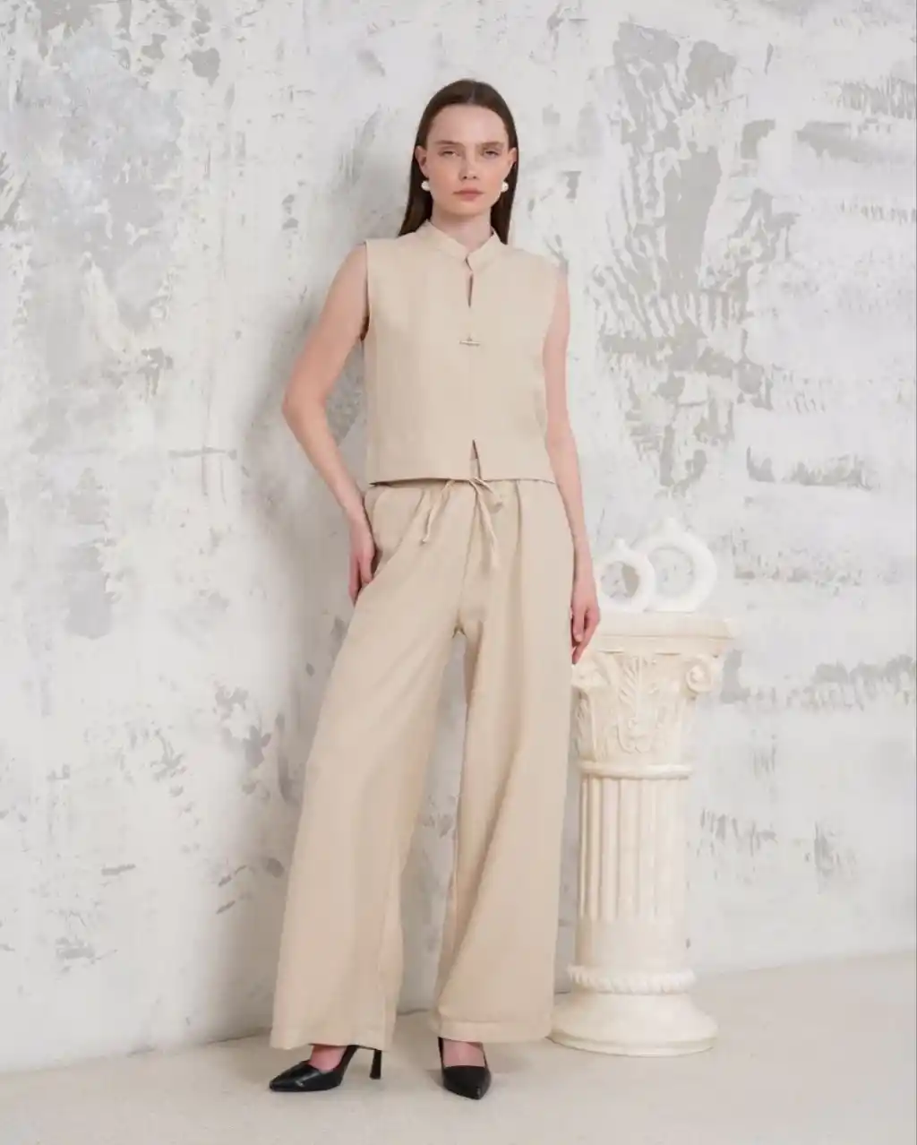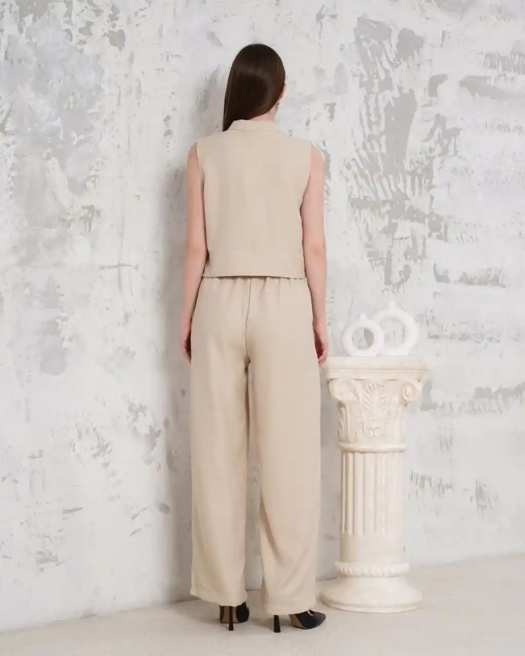 Kadın giyimde şıklığı ve tarzı bir arada sunan Broşlu Yelek Pantolon Takım Bej S255821, zarif görünümü ile dikkat çekiyor. Bu takım, özel davetlerde, iş toplantılarında ya da günlük şıklıkta rahatlıkla tercih edilebilir.