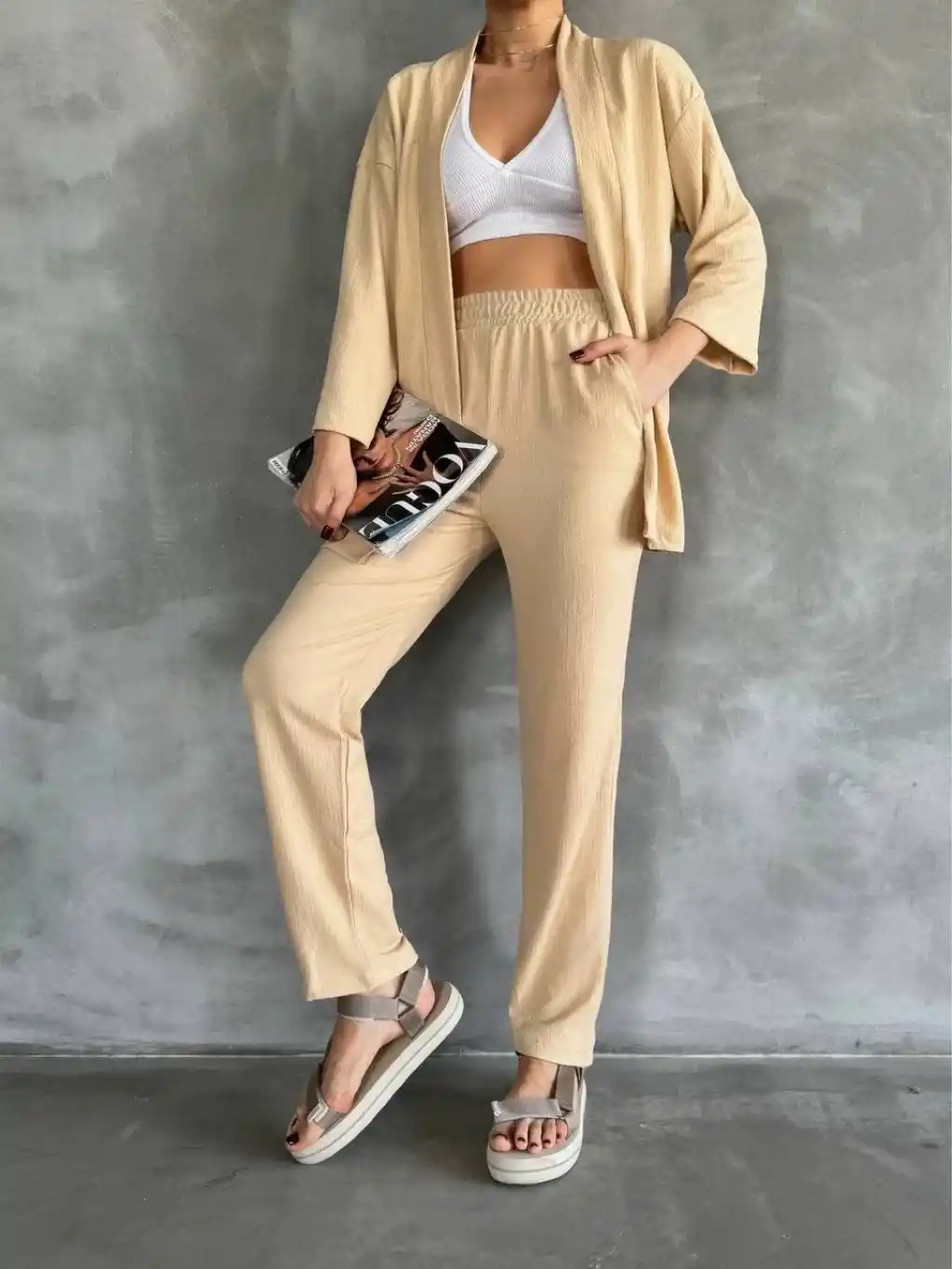 Pantolon yırtmaçlı elbise ikili triko takım vizon elf